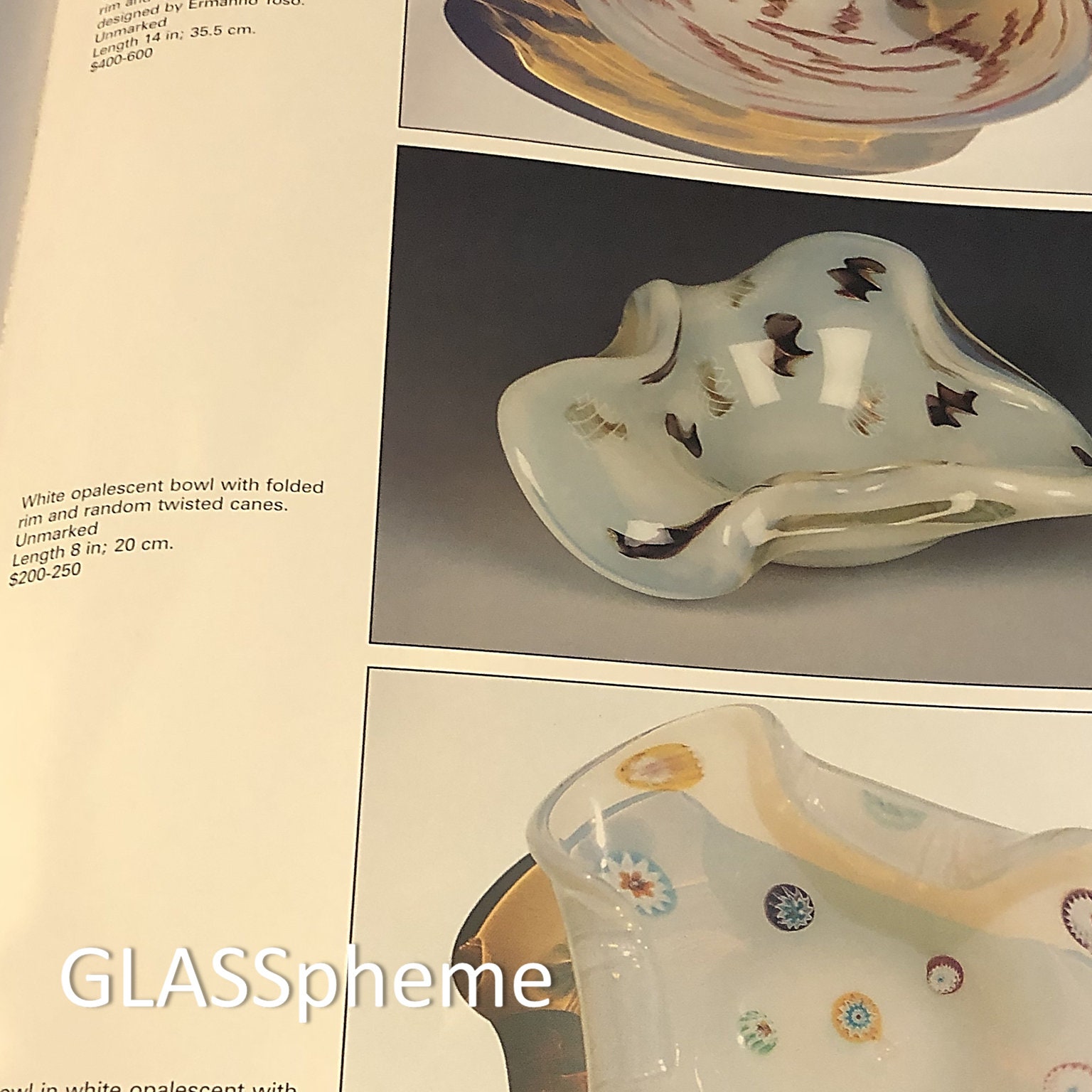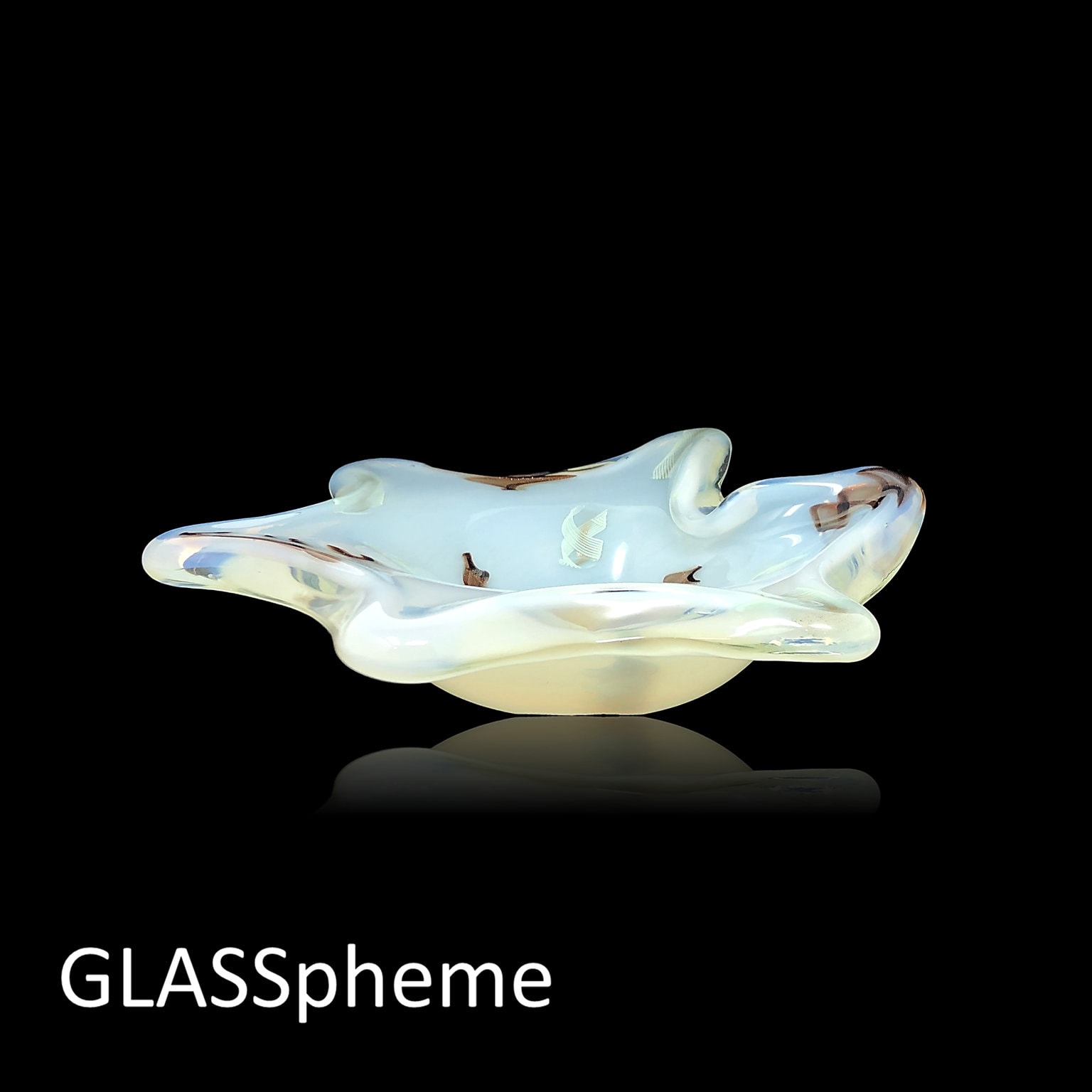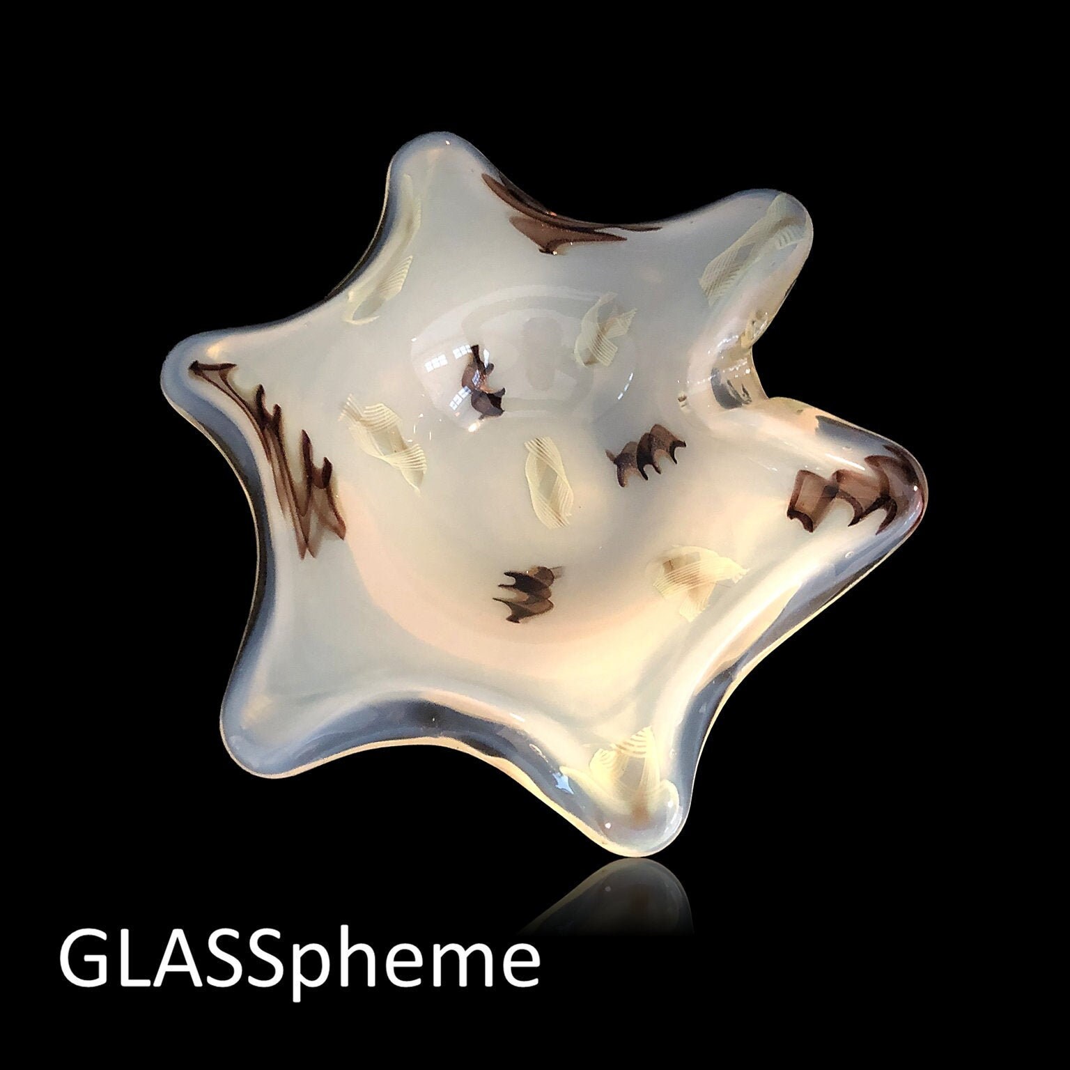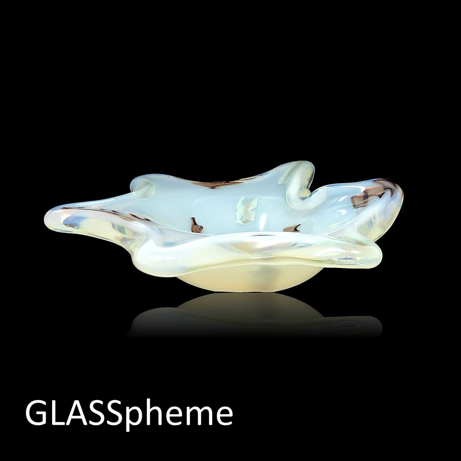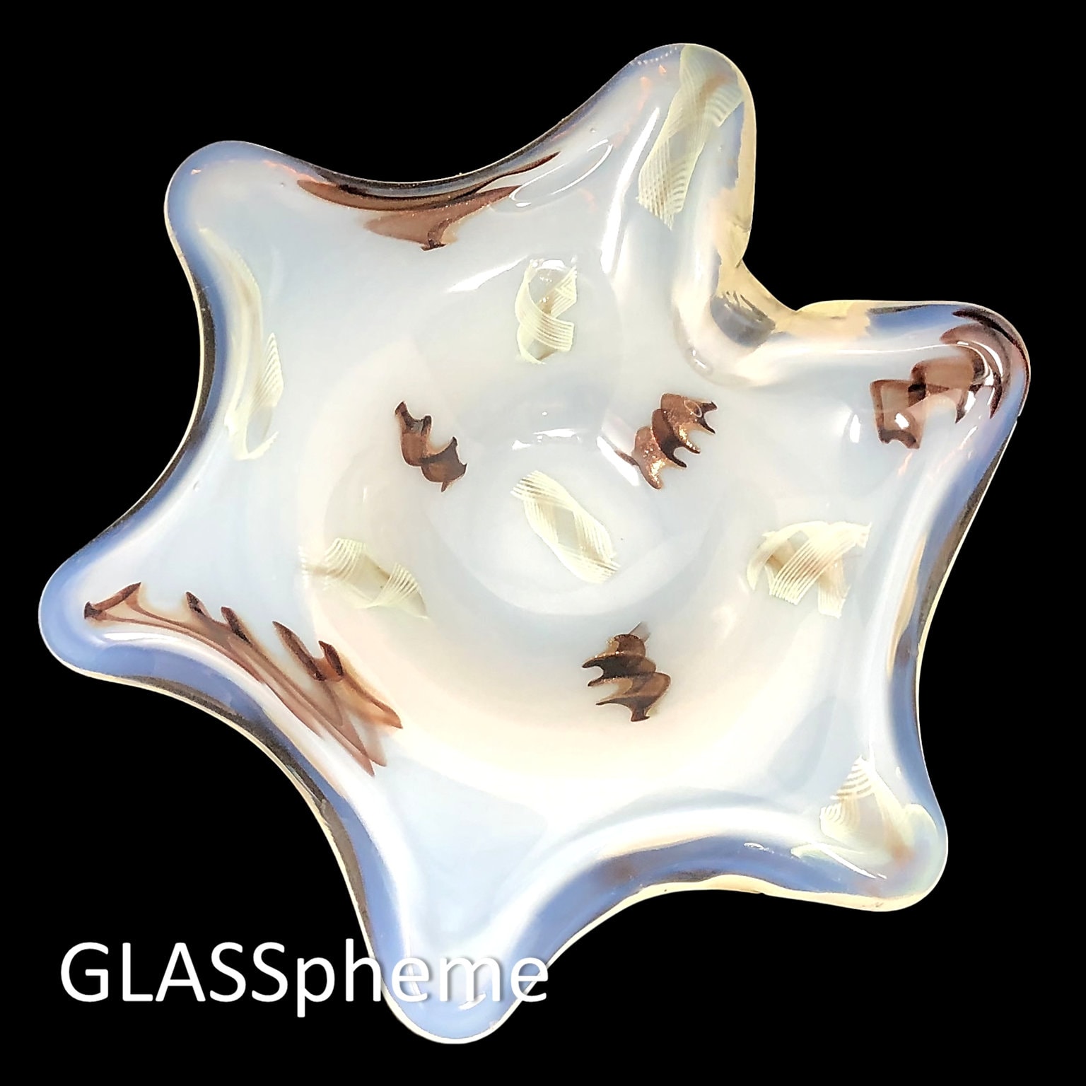 This is a magnificent example of Fratelli Toso's opalescent glass genius! This C.1950s beauty is done in a translucent opalescent lattimo, decorated with exquisite brown, white, and copper twisted zanfirico ribbons. There is one large indentation as if for a cigar, so this breathtaking piece can serve as an ashtray, candy or trinket dish, when not empty and scoring admiration from all who behold it.