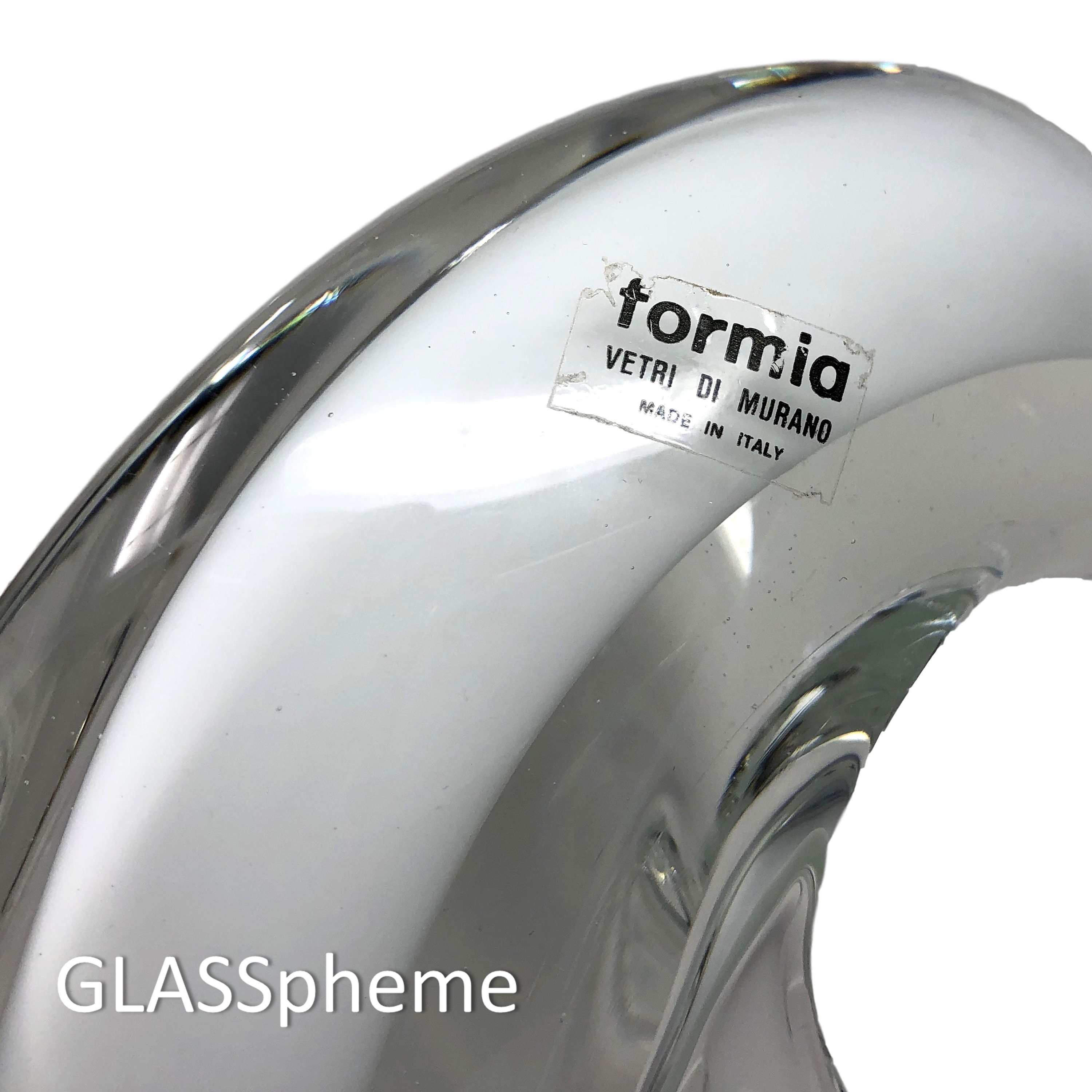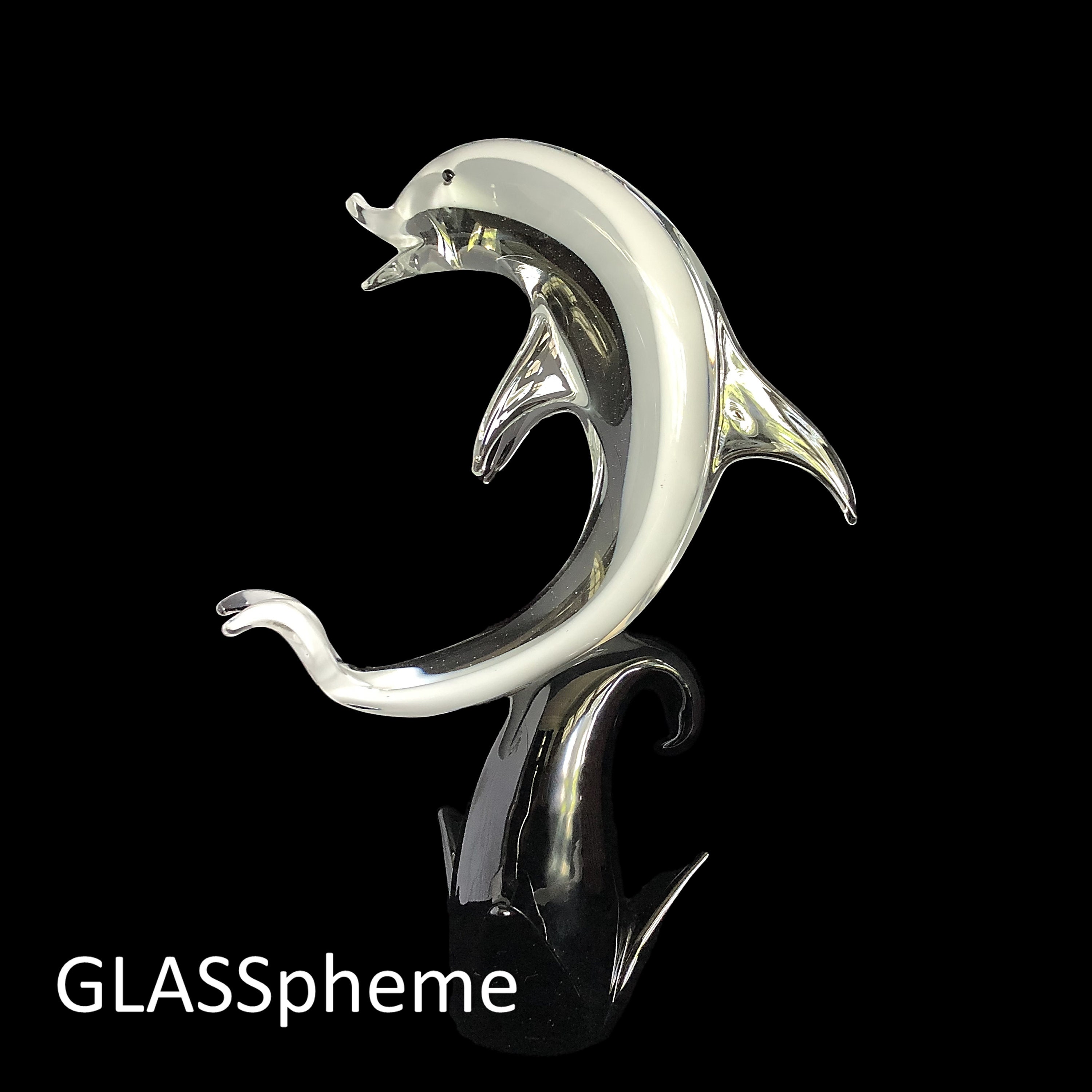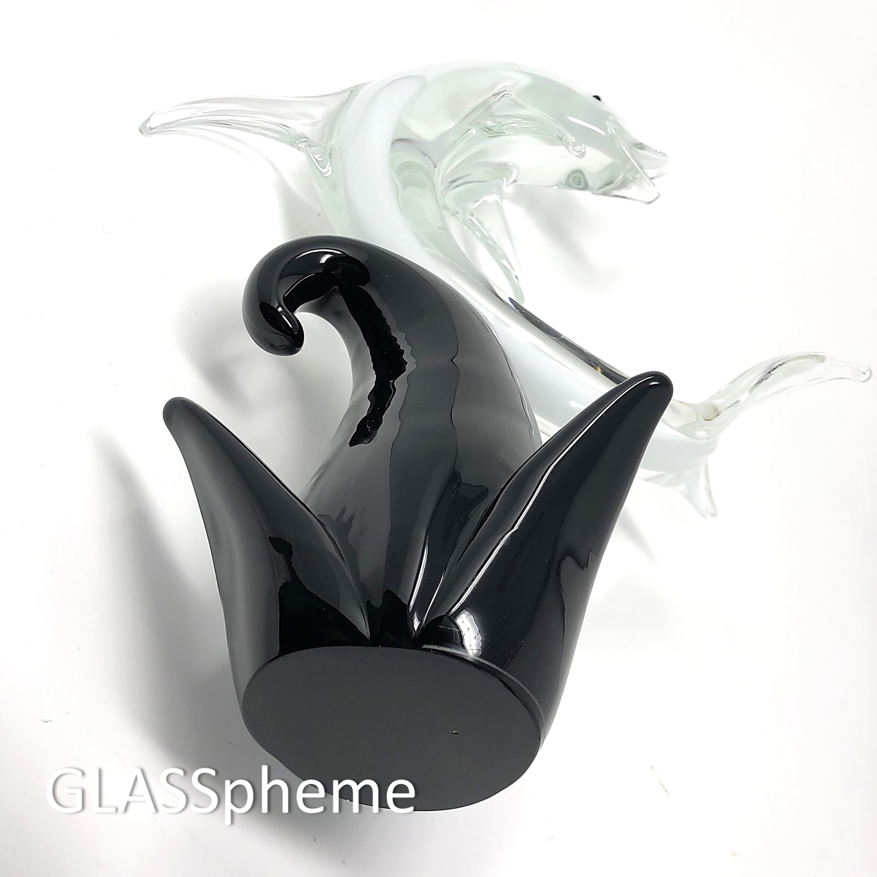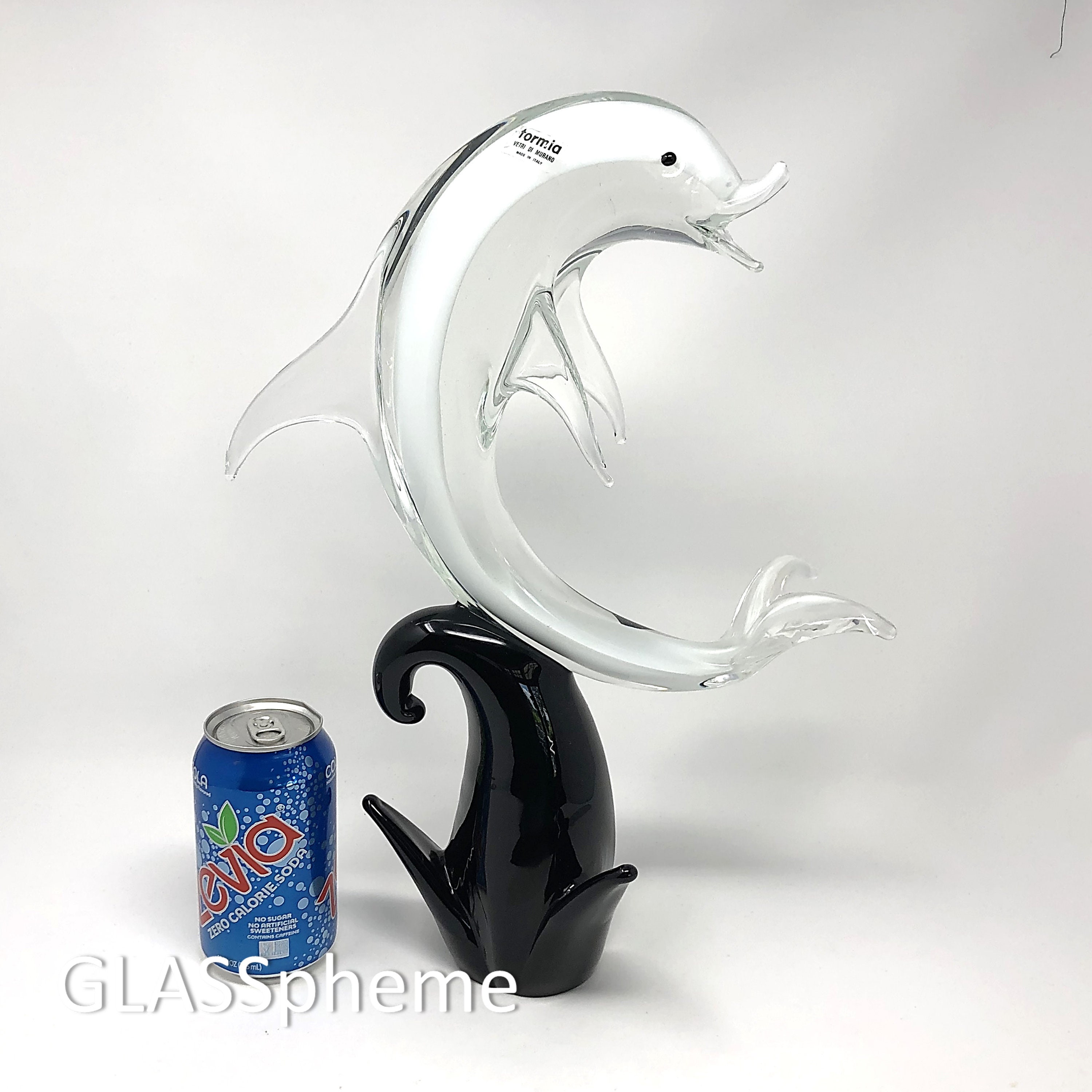 You're looking at a big gorgeous leaping glass dolphin sculpture by Formia Di Vetri, dating probably from the 1990s based on the worn plastic Formia label that remains. Formia's furnaces were in production between 1962 and late 2016, when it declared bankruptcy and reorganized under a different name. Formia has produced the most spectacular and highly-coveted Murano glass animals of any any modern-day Murano furnace, and you'll find many of these misattributed to Alfredo Barbini and Archimede Seguso. Our spectacular crystal and white sommerso dolphin, riding a fabulous black glass base, stands 16" tall and weighs over 8 lbs! The base wear on this beauty is minimal and it's otherwise as minty as it was on the day it was produced.