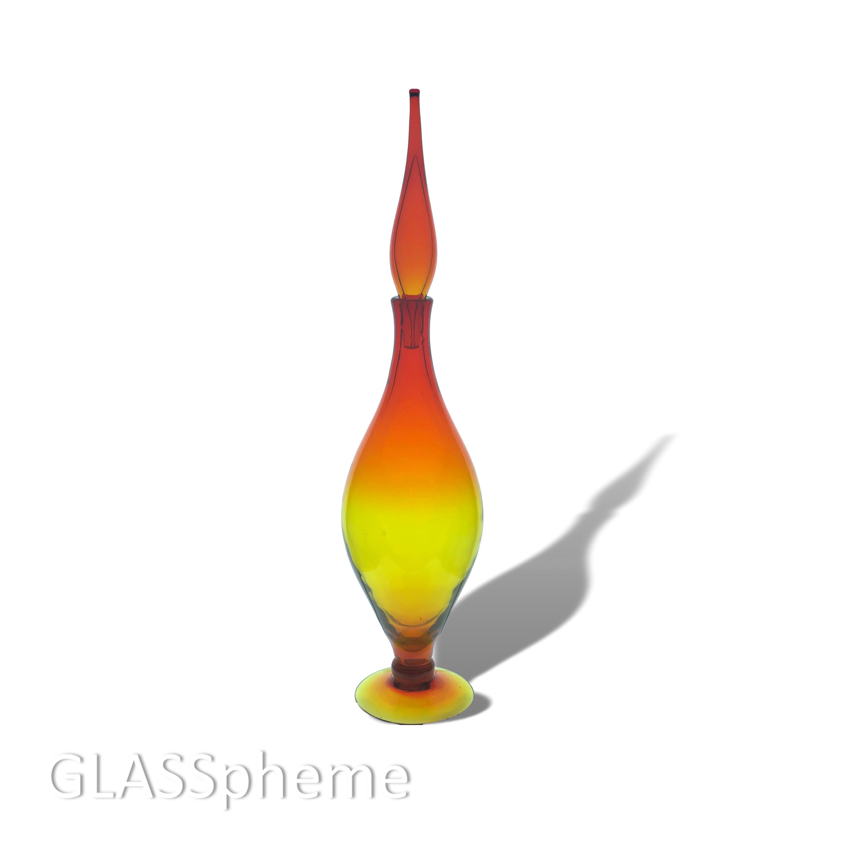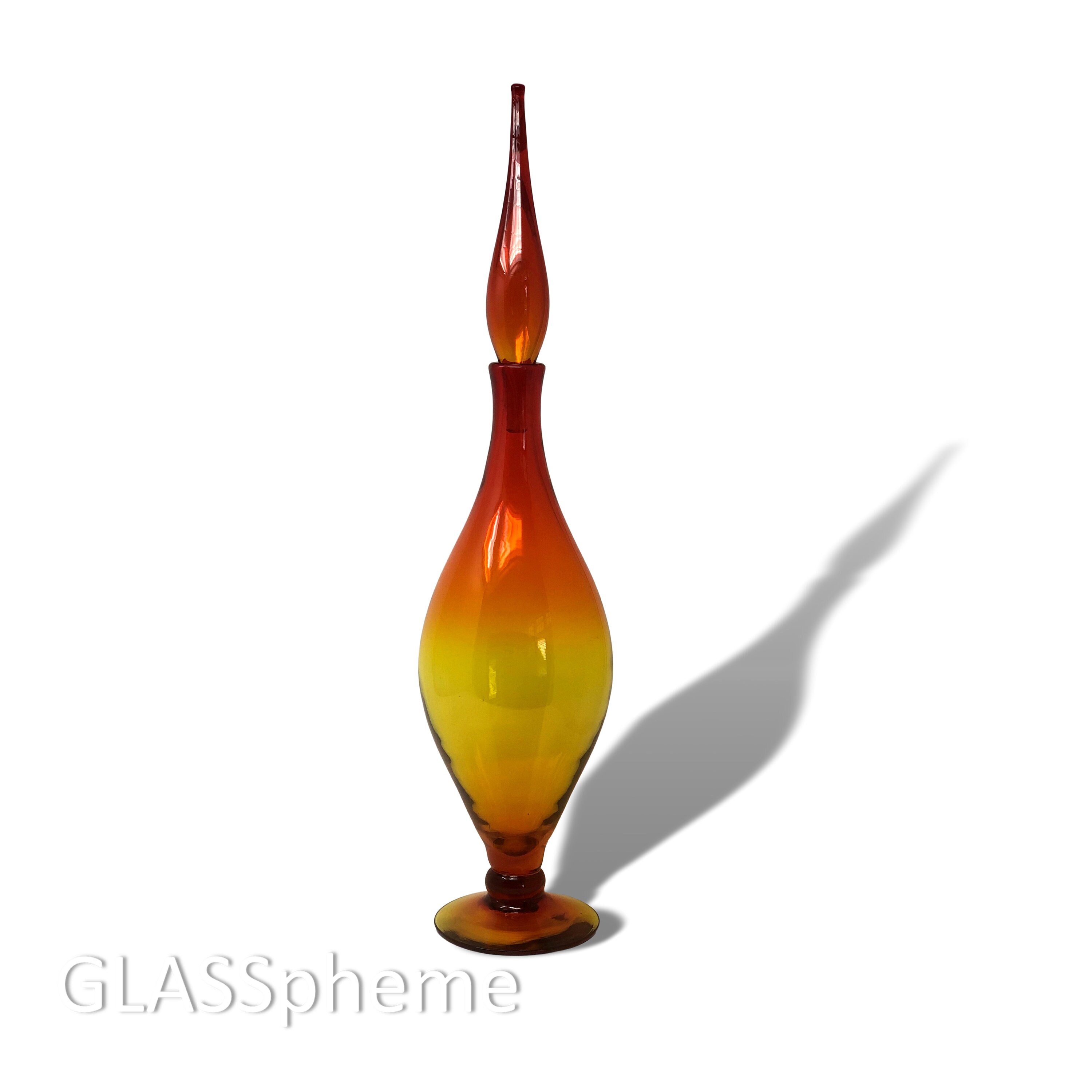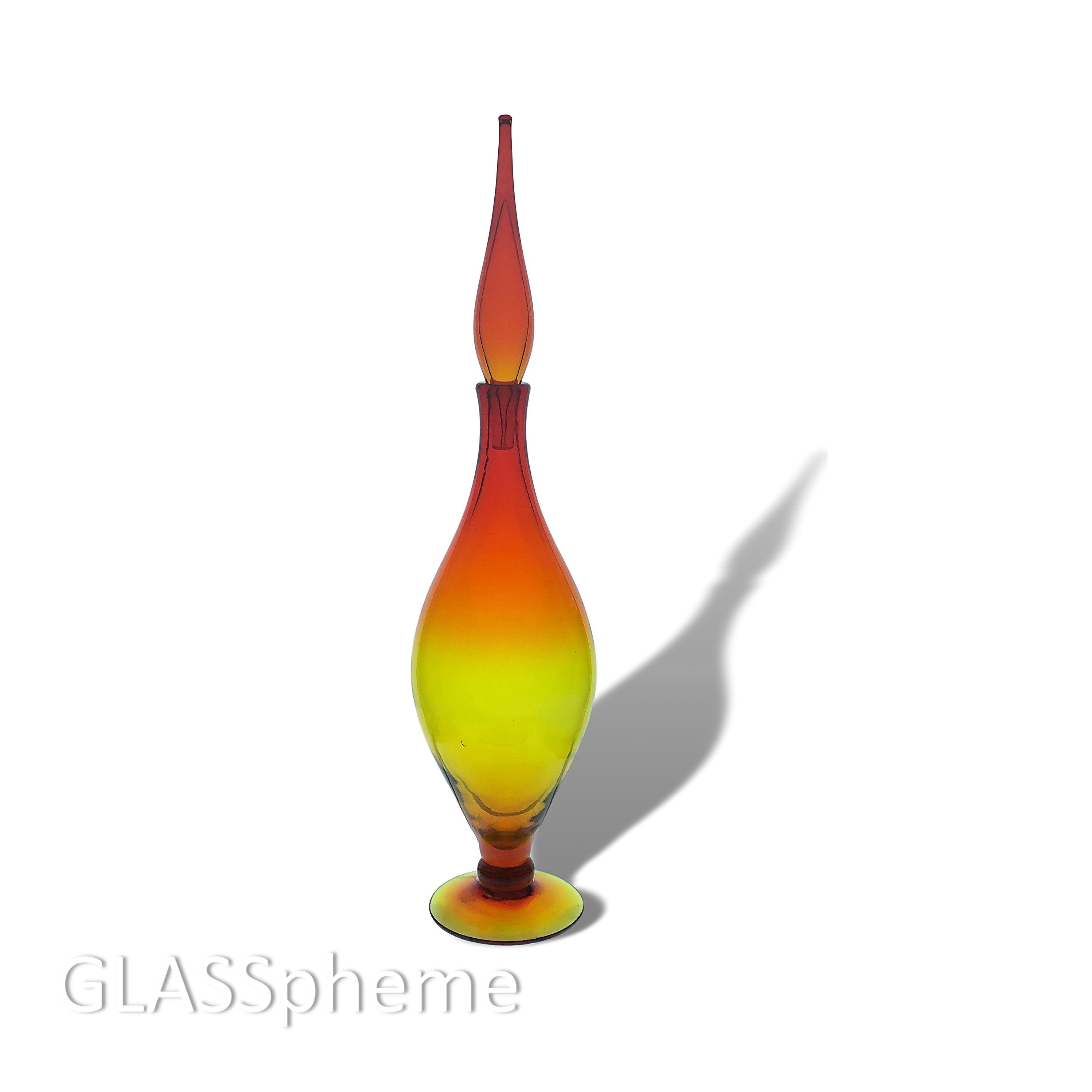 This BIG glittering 23" tall Joel Myers BLENKO beauty in Tangerine/amberina is the #6528 footed glass decanter first produced in 1965. It explodes with deep red/orange/yellow hues in the light. Breathtaking piece!