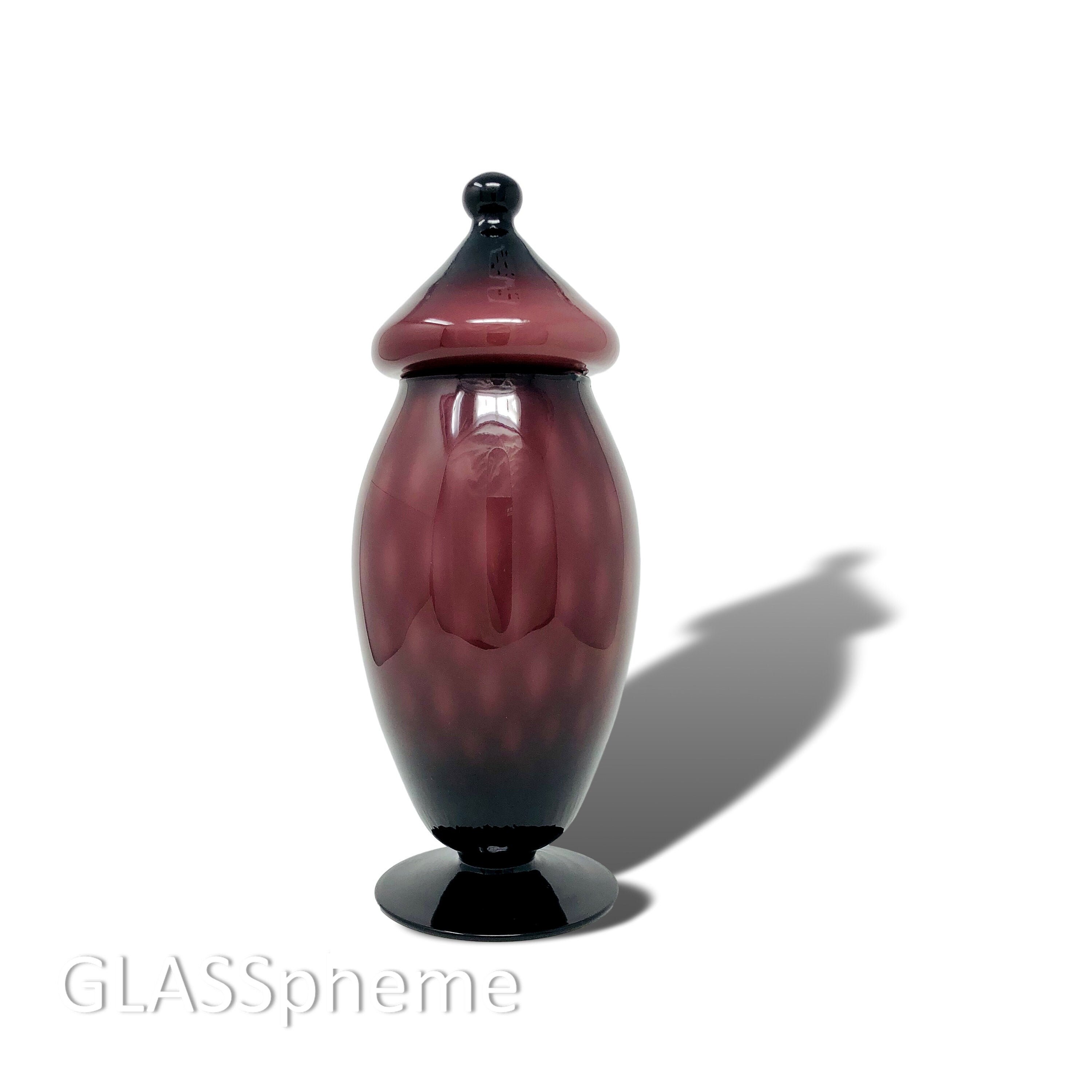 You're looking at a GORGEOUS 14" tall mid-century Empoli glass beauty--a purple/amethyst thatch-pattern footed cased glass jar with circus tent lid. Roughly 5.5" wide in widest diameter, this baby is large and commanding and in perfect vintage condition.
