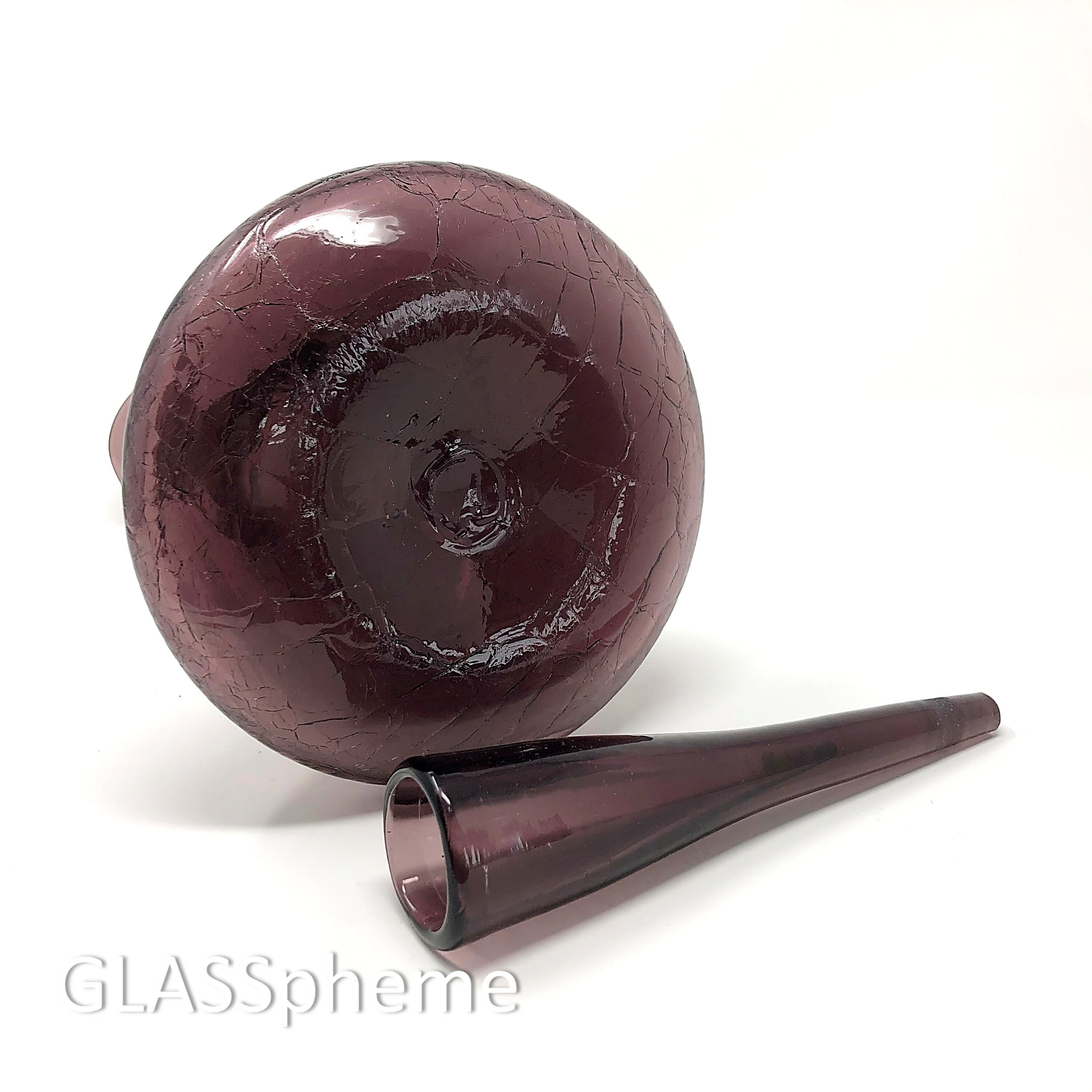 Our amethyst crackle glass beauty was produced in 1961 or the first half of 1962--1961 and 1962 were the only years in the 1960s that amethyst was produced, and ours has the Blenko acid-etched stamp on the base.