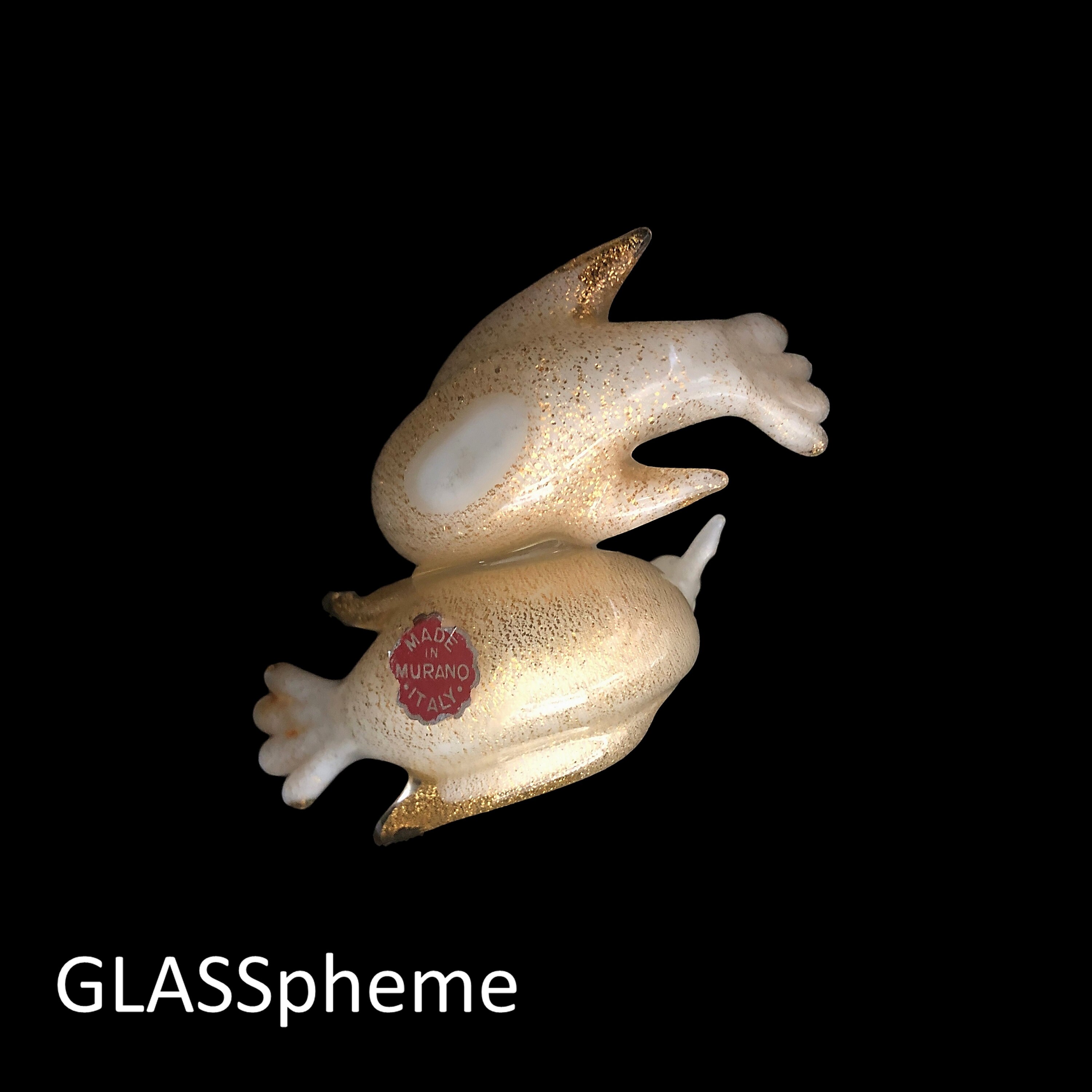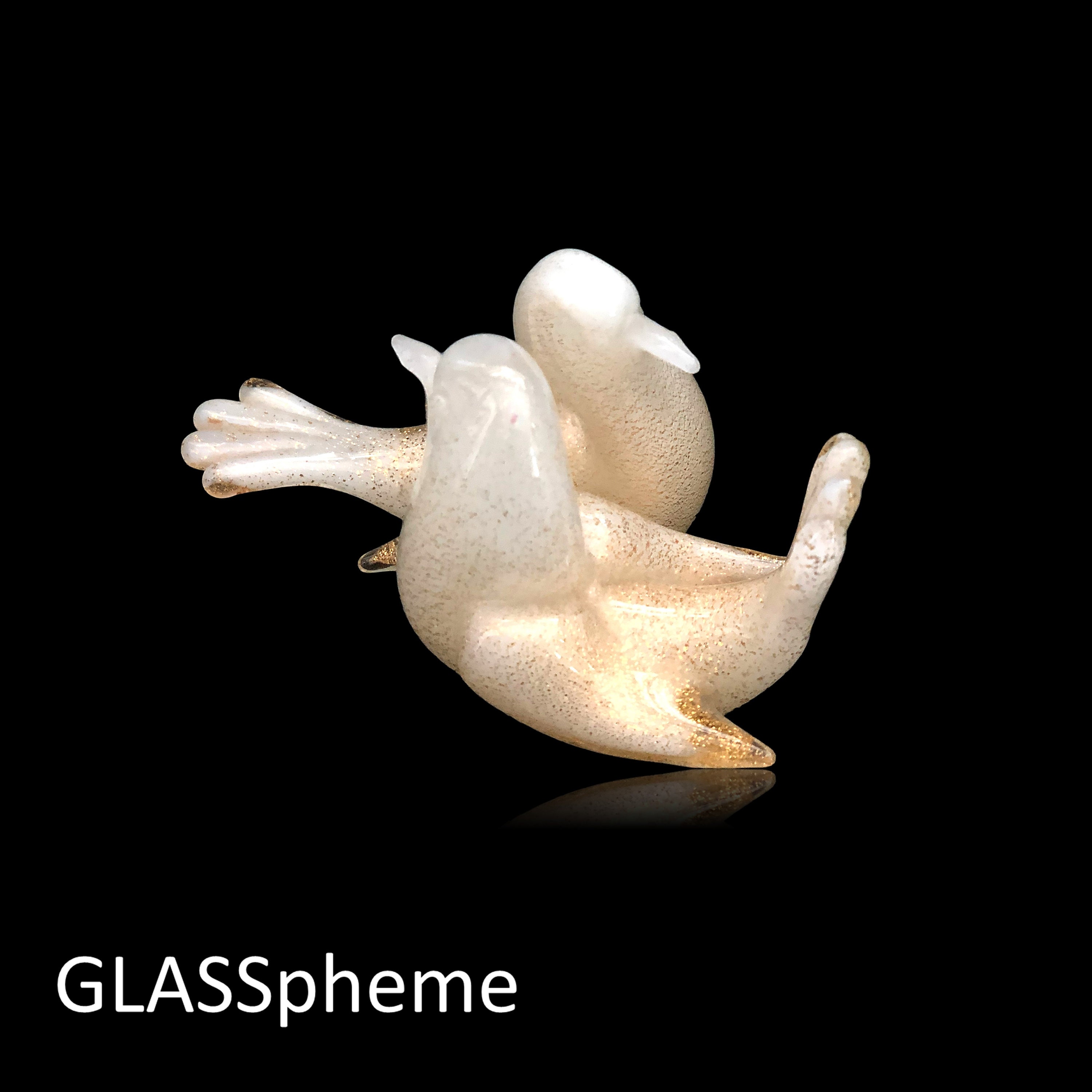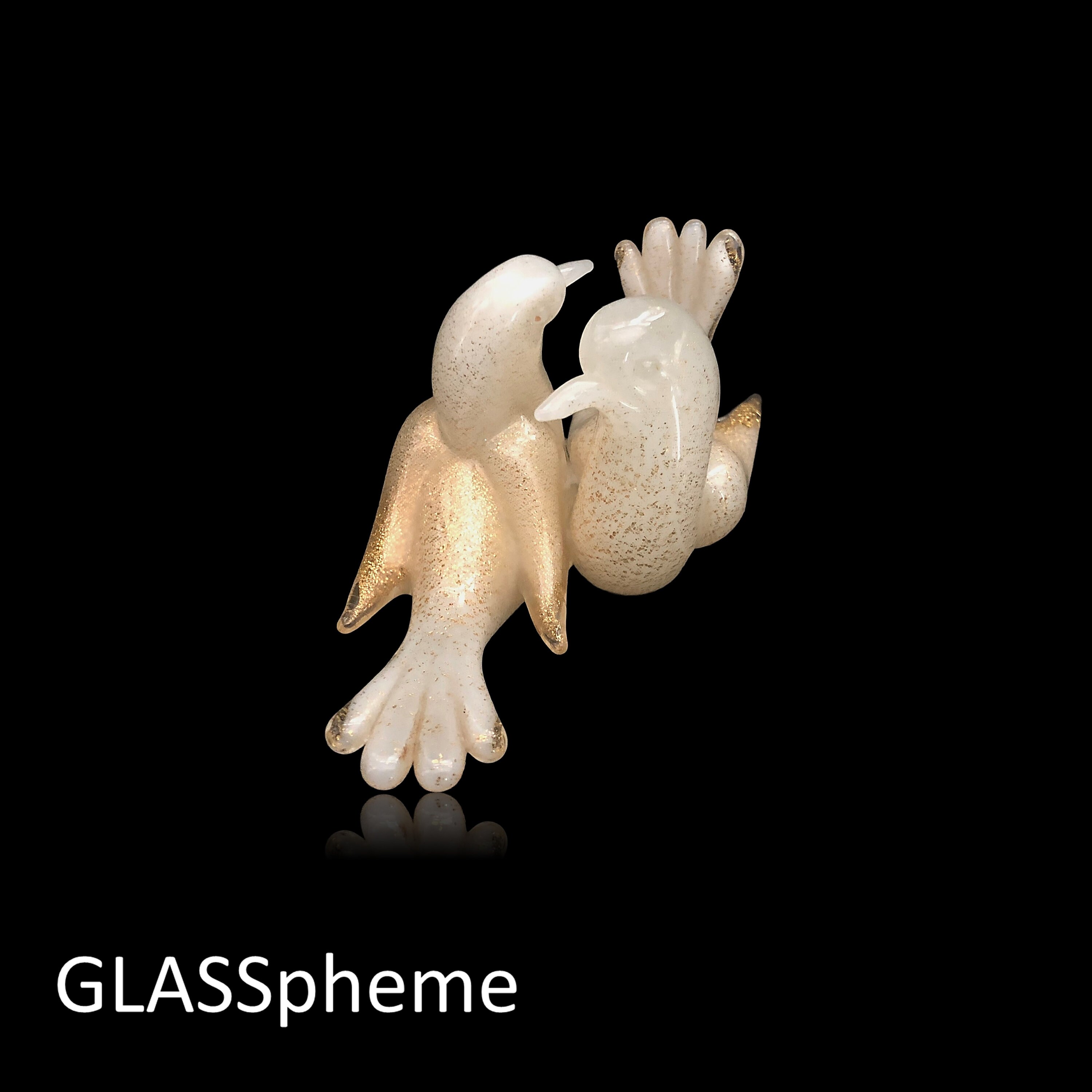 This EXQUISITE Archimede Seguso Murano glass love birds sculpture is done in milky white lattimo glass with gold aventurine flecks and sports a red scalloped Archimede Seguso Murano Made in Italy label on its base.