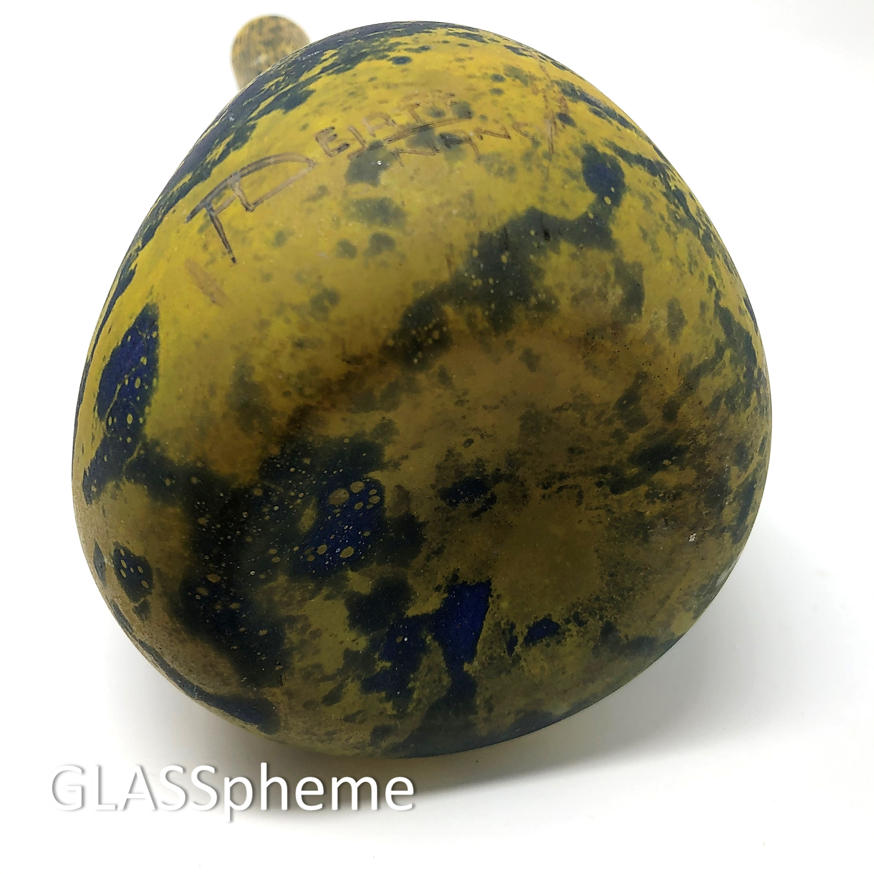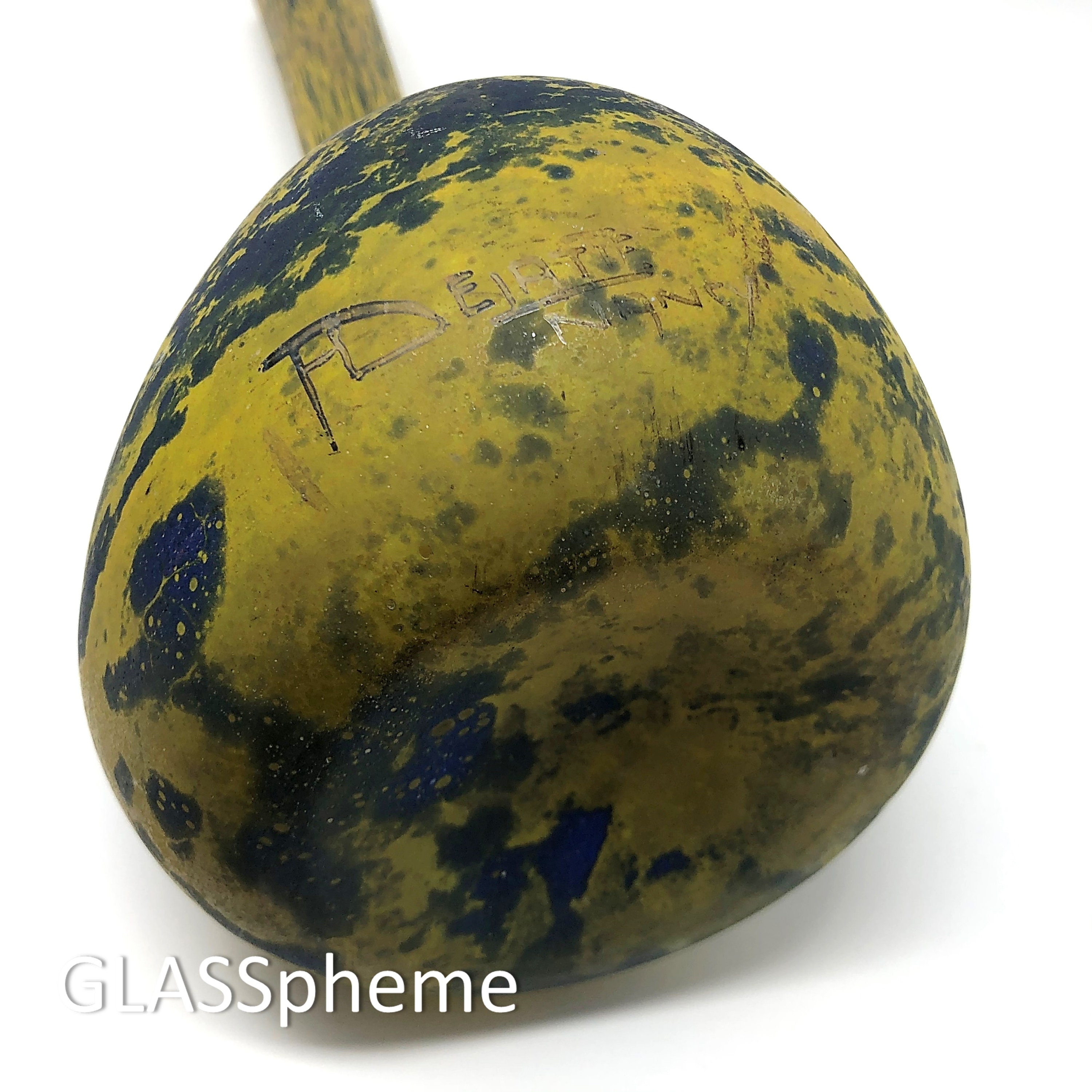 This 1920s French Art Nouveau vase by Andre Delatte is an unusual stunner. While Delatte's furnace was located in Nancy, France and reportedly hired workers from Daum, also located in Nancy, Andre Delatte glass was not produced for or by Daum Nancy (as many online sellers imply) although much of its work was of similar design and quality. Andre Delatte closed shop in 1933 due to the depression while Daum Nancy continued producing glass and is in fact still in business. As such, Andre Delatte glass exists in far less volume than Daum Nancy today. This lovely piece appears to have been either professionally repaired at some point during or after production. Look closely at photo #4. This is very hard to spot and is not material for such an old piece.