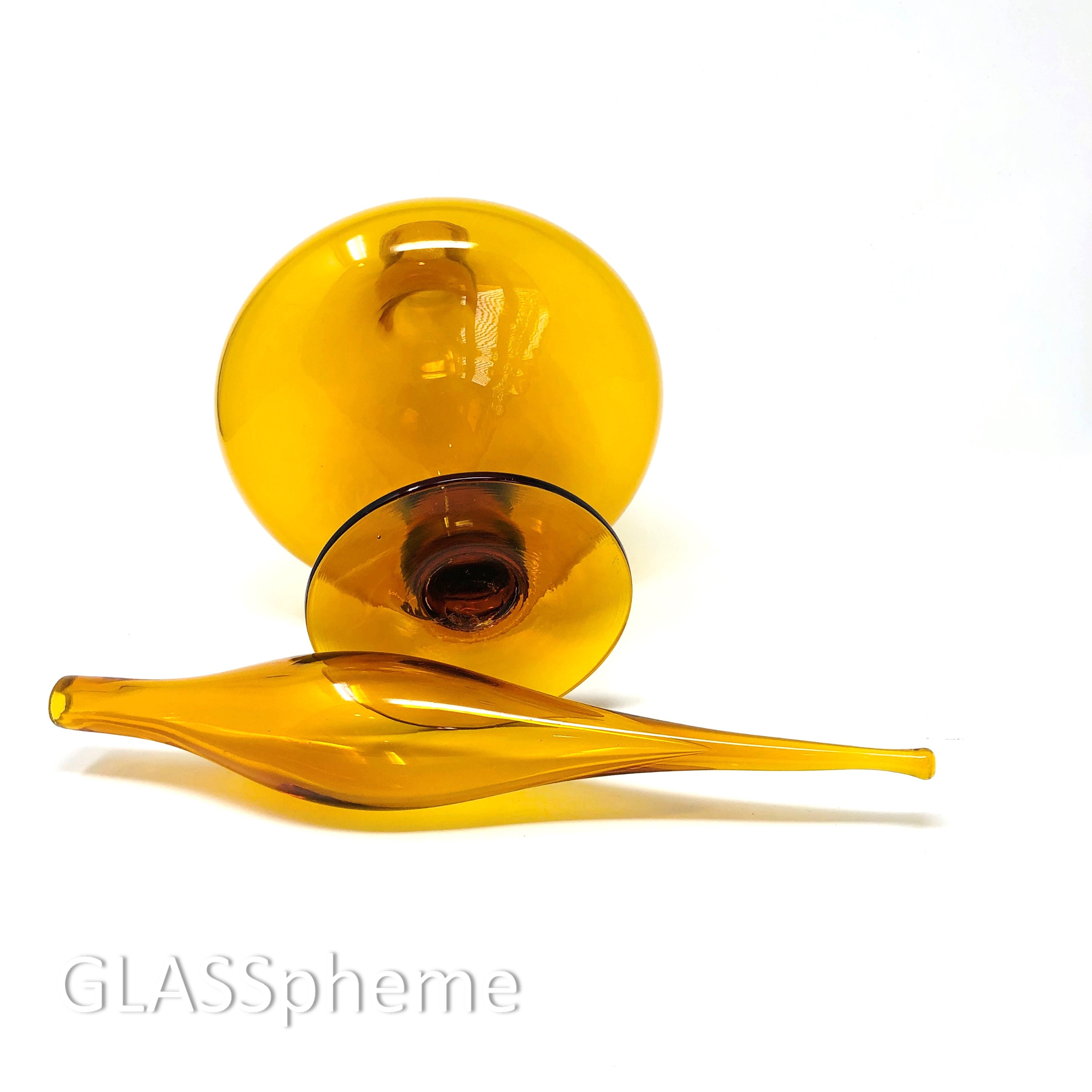 Amongst Wayne Husted's last designs for Blenko before he left in 1963 was the 6212 footed decanter, and it was so incredibly popular, it remained in production through the remainder of the 1960s AND the 1970s! (While the original flame stopper was changed to a ground teardrop stopper in 1970, the rest of the decanter and its model number remained the same.) In fact, the 6212 decanter is probably the most widely available design of the mid-century period. But this minty beauty stands out as a bit of a rarity. The color is WHEAT (don't let the brightness in the backlit photo fool you--I've compared this to jonquil and honey and it's right in the middle), made between 1969 and 1983. But we can trace our 6212 Wheat decanter back to 1969 because it was the first year WHEAT was produced AND the last year that the 6212 had a flame stopper. In short, WHEAT was a one year only color for the 6212 decanter, flame stopper version. And our lonely speciman is in mint condition--I don't believe it has ever held fluid because the interior is spotless!