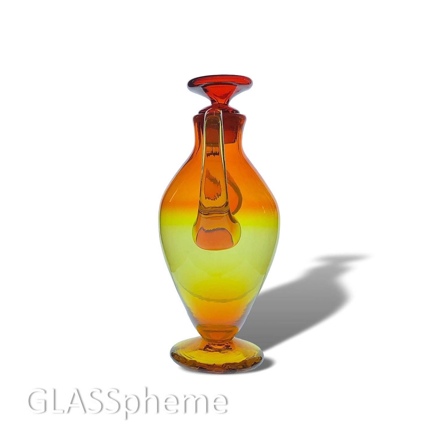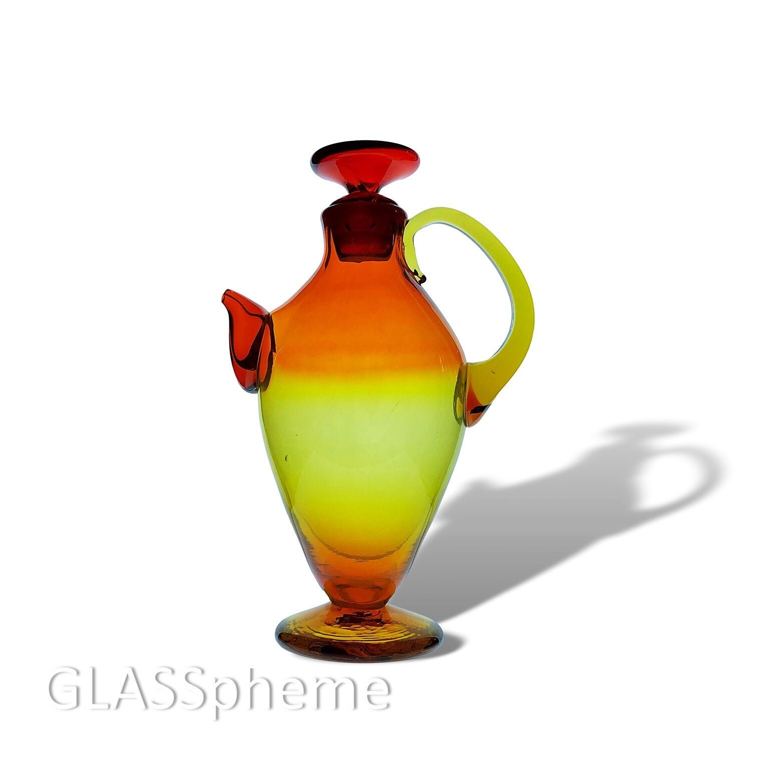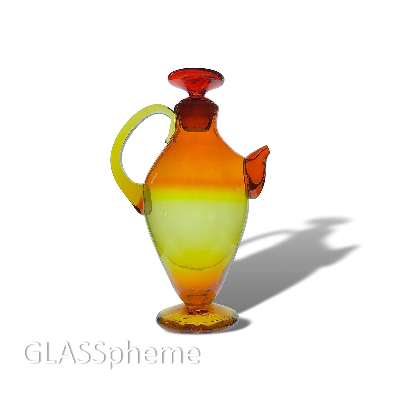 Wayne Husted's #573 "Cocktail pitcher with hollow spout ice guard" (as described in the 1957 Blenko catalog) was produced for three years (1957-1959), with Tangerine in production for all of them. This beautifully formed speciman has a perfectly fitting original ground stopper, rough pontil and no damage. It does, however, have a strange condensation-like thing going on IN THE GLASS itself--not from the interior, which is sparkling clean and may well never have held liquid. I've seen 'smokers breath' captured in some Blenko stoppers and wonder if our dedicated glass blower might have exhaled some smoke while blowing this beauty. I'm unable to capture this oddness in a photograph but you'll only notice it under strong direct light--definitely not on display!