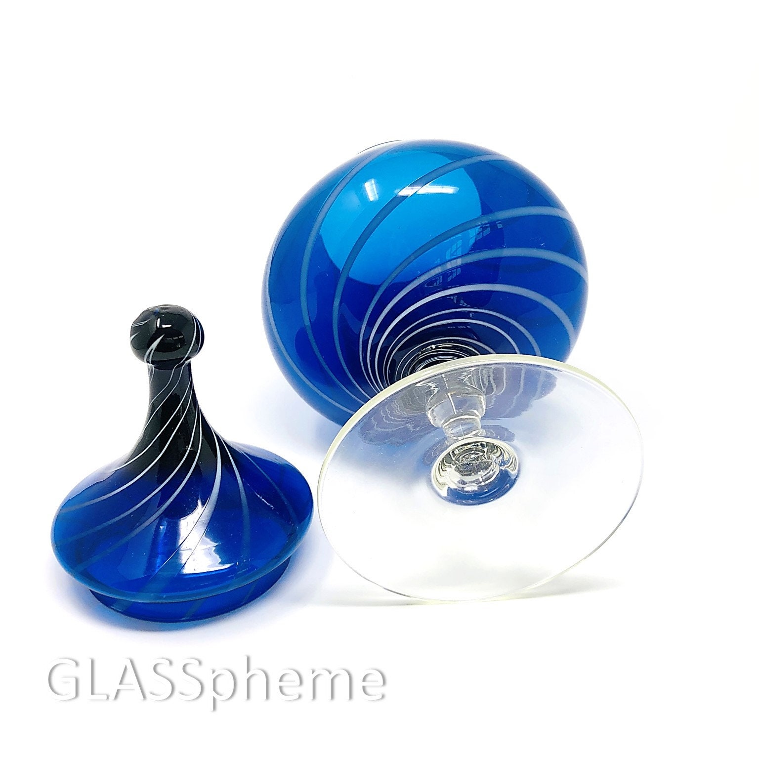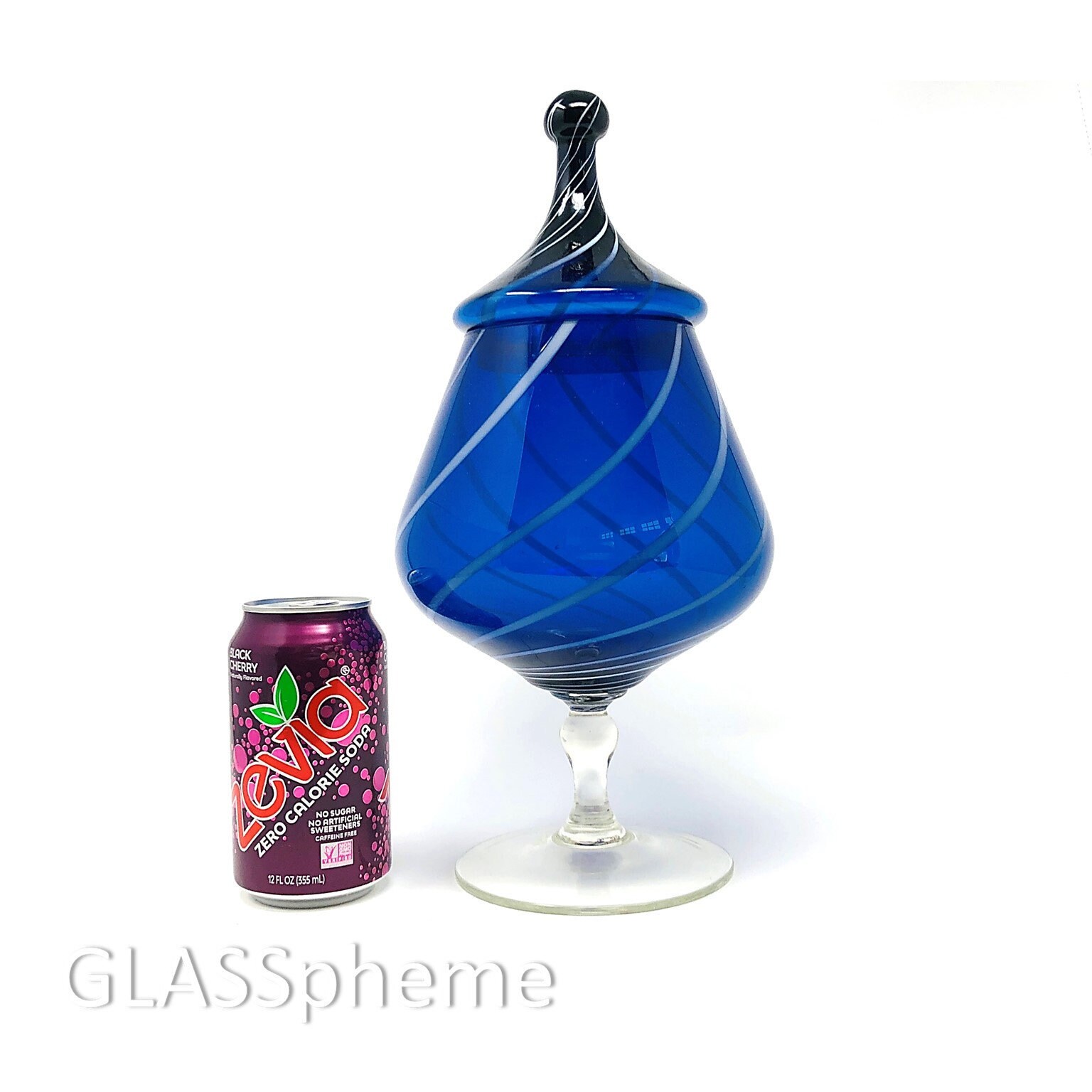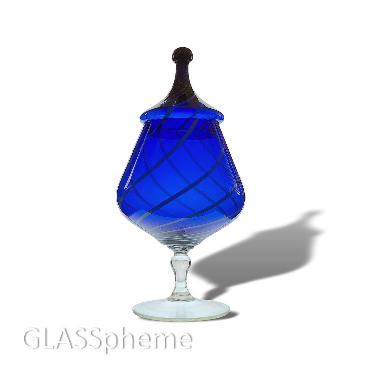 You're looking at a FABULOUS mid-century design from Italy's Empoli region. Done in a deep blue probably best described as COBALT, our Empoli glass beauty has a clear foot and matching circus-tent lid. Given the tell-tale white swirls on glass decanters imported by Alrose, my best guess is that this lovely speciman was one of theirs. This beautiful jar is in exquisite condition--cannot find a flaw. This would make an AWESOME gift.