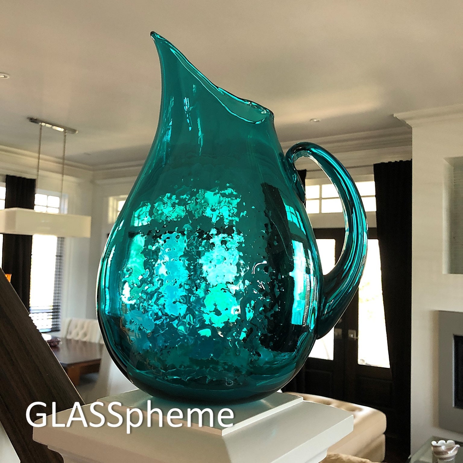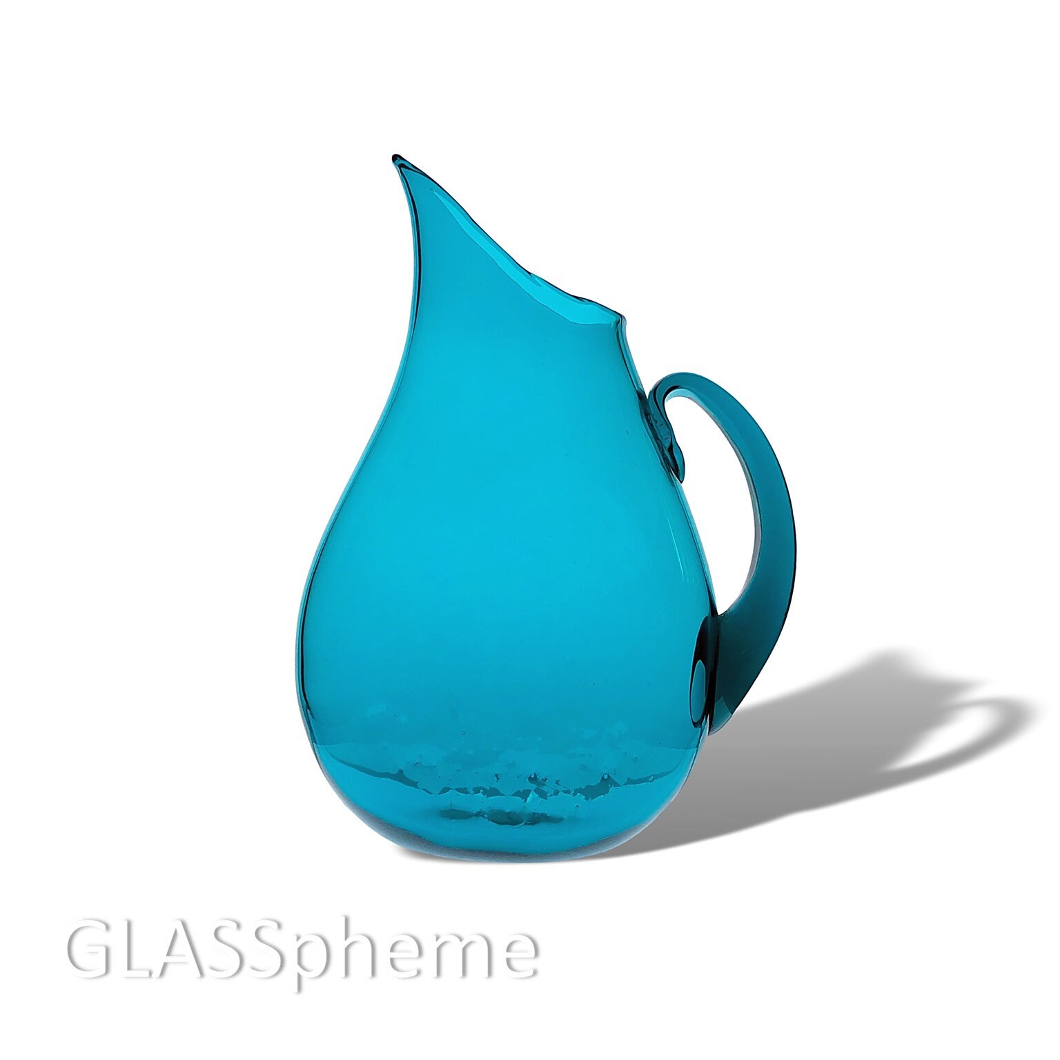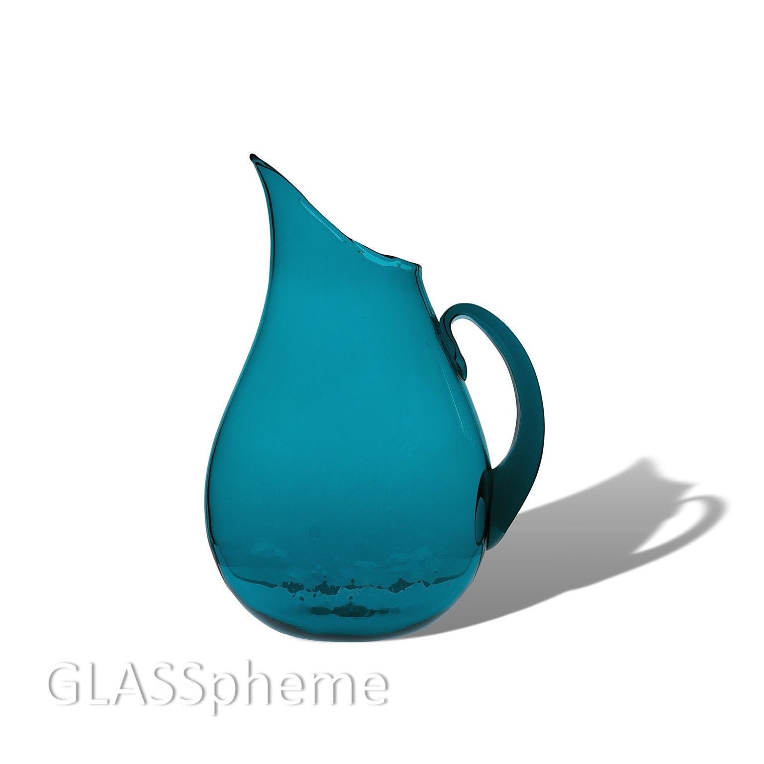 Blenko's big, beautiful and curvaceous flat-sided pitcher (design #967 by Winslow Anderson), produced from about 1950 through 1957, is popular for its graceful sweeping lines. textured sides and super modern vibe. Ours here in a particularly deep TURQUOISE, which was produced only for the first two years of our pitcher's production.