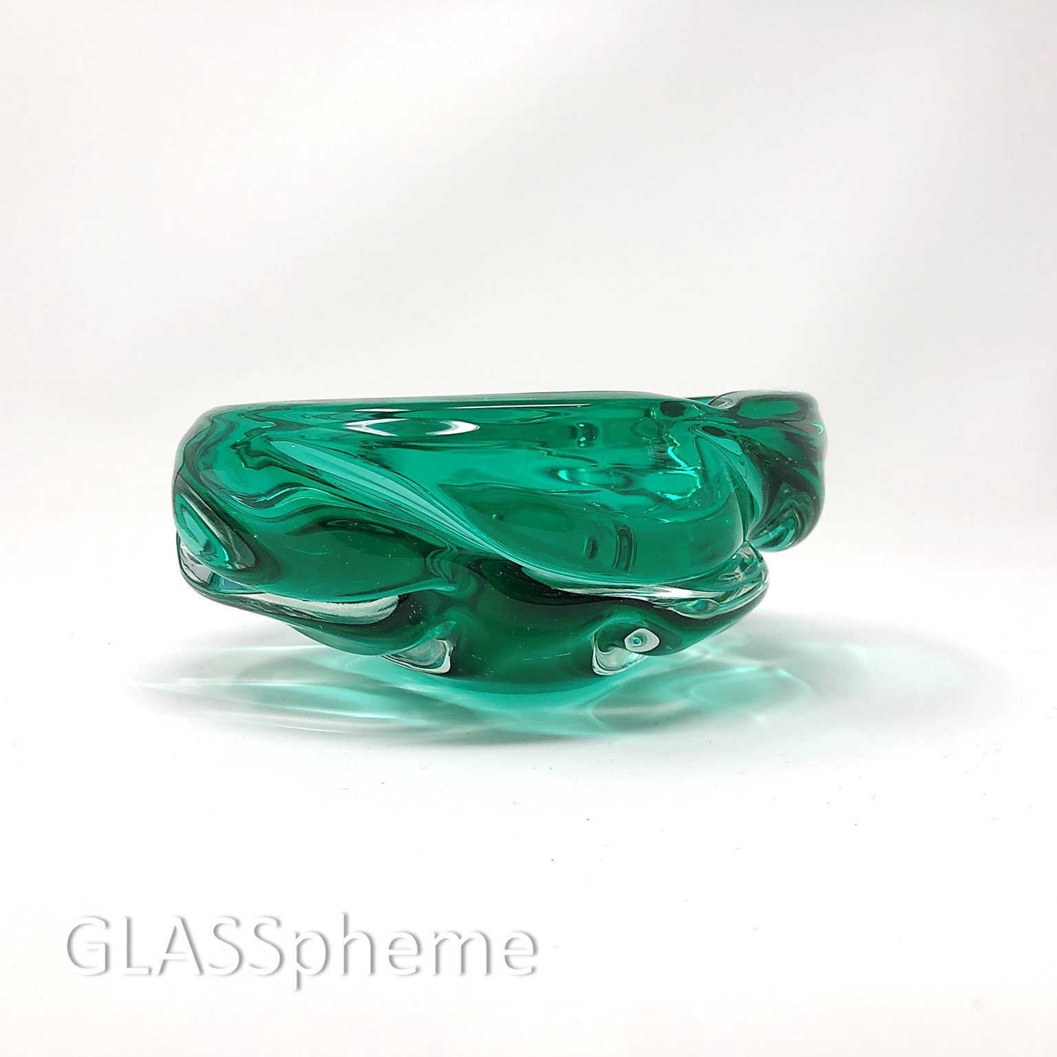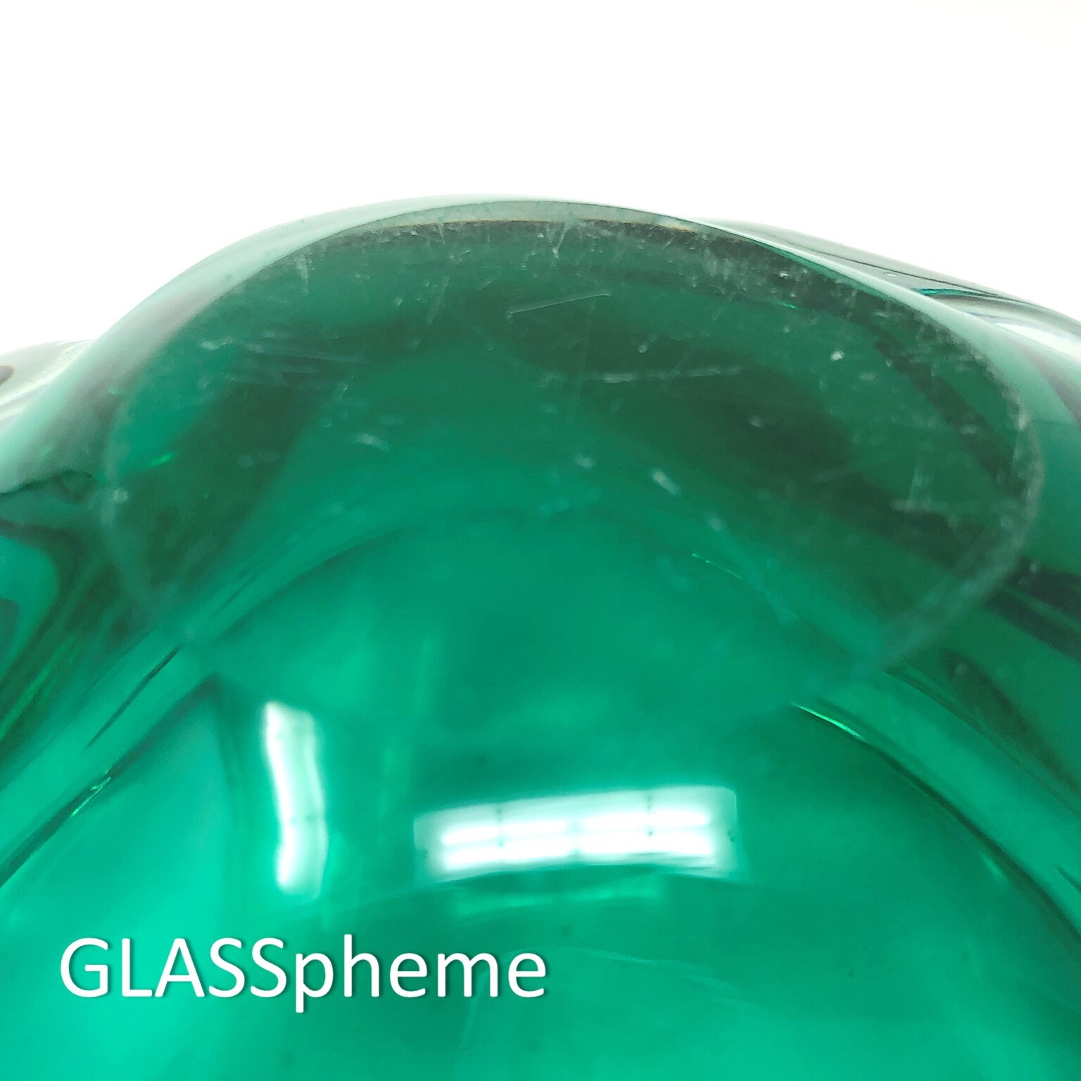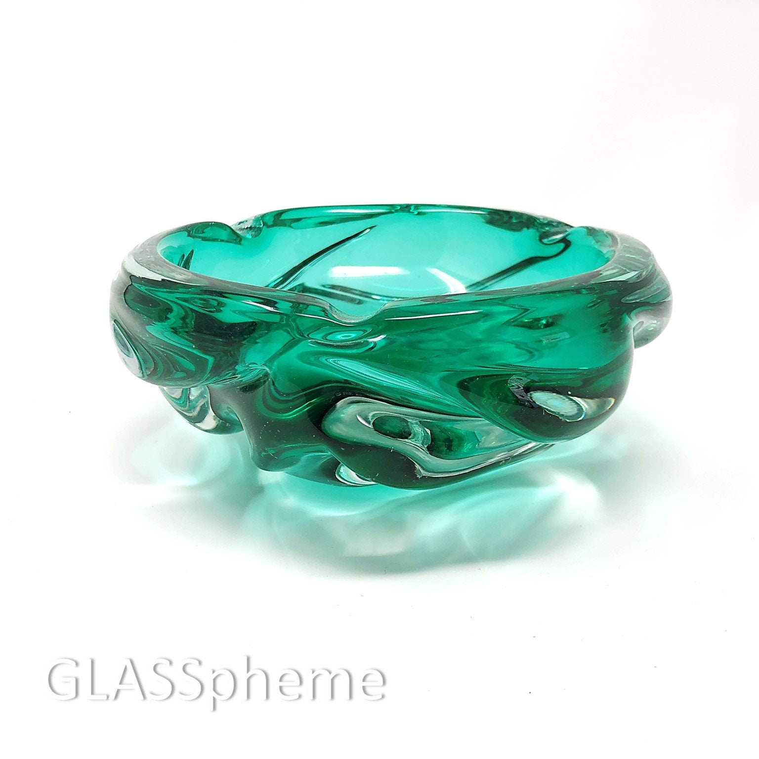 You are looking at a fabulous mid-century Murano sommerso glass bowl or ashtray probably by Archimede Seguso. The label is long gone, but this design, with the large blobs around the exterior is well documented. This hefty green beauty, weighing in at over 4 lbs, screams MAN CAVE (especially for cigar smokers) and is in prime vintage condition with expected base wear and the occasional scratch or scuff (none noteworthy).