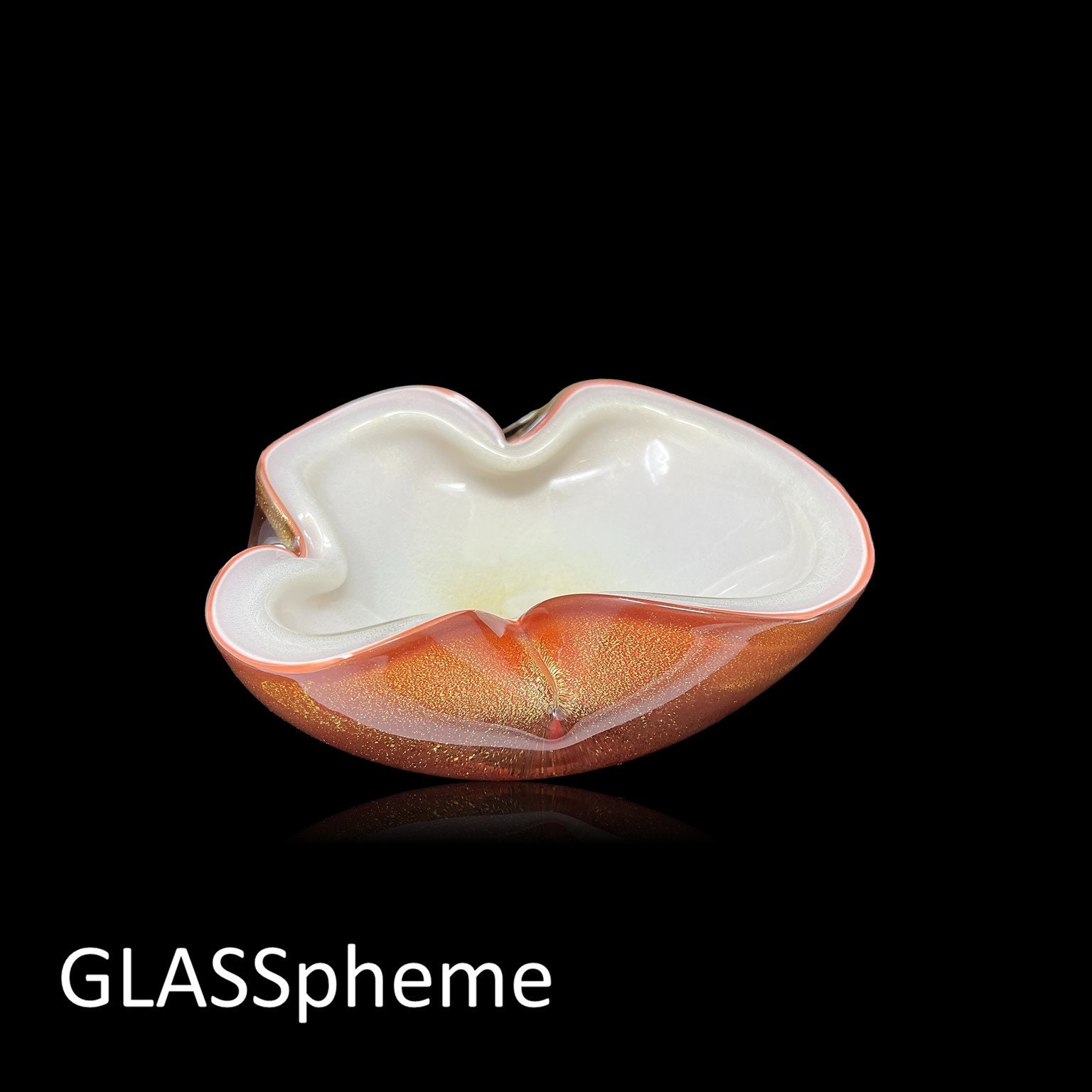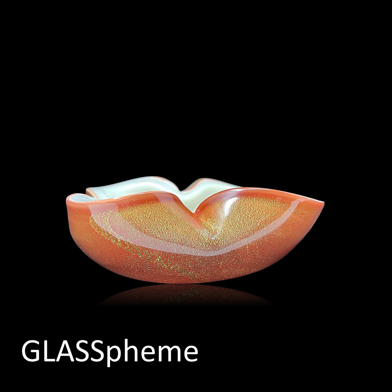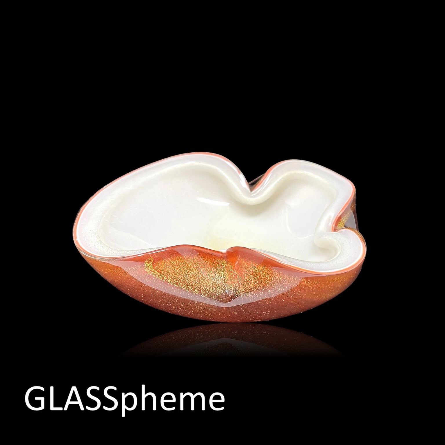 This exquisite jewel of a Murano bowl is unmarked but it sports all the hallmarks of Alfredo Barbini. This breathtaking beauty is done in "Chinese orange" glass layered over creamy lattimo (incamiciato) with a thin layer of gold aventurine throughout, and the bowl's exterior then encased in crystal. What a killer beautiful piece in the mintiest of condition!