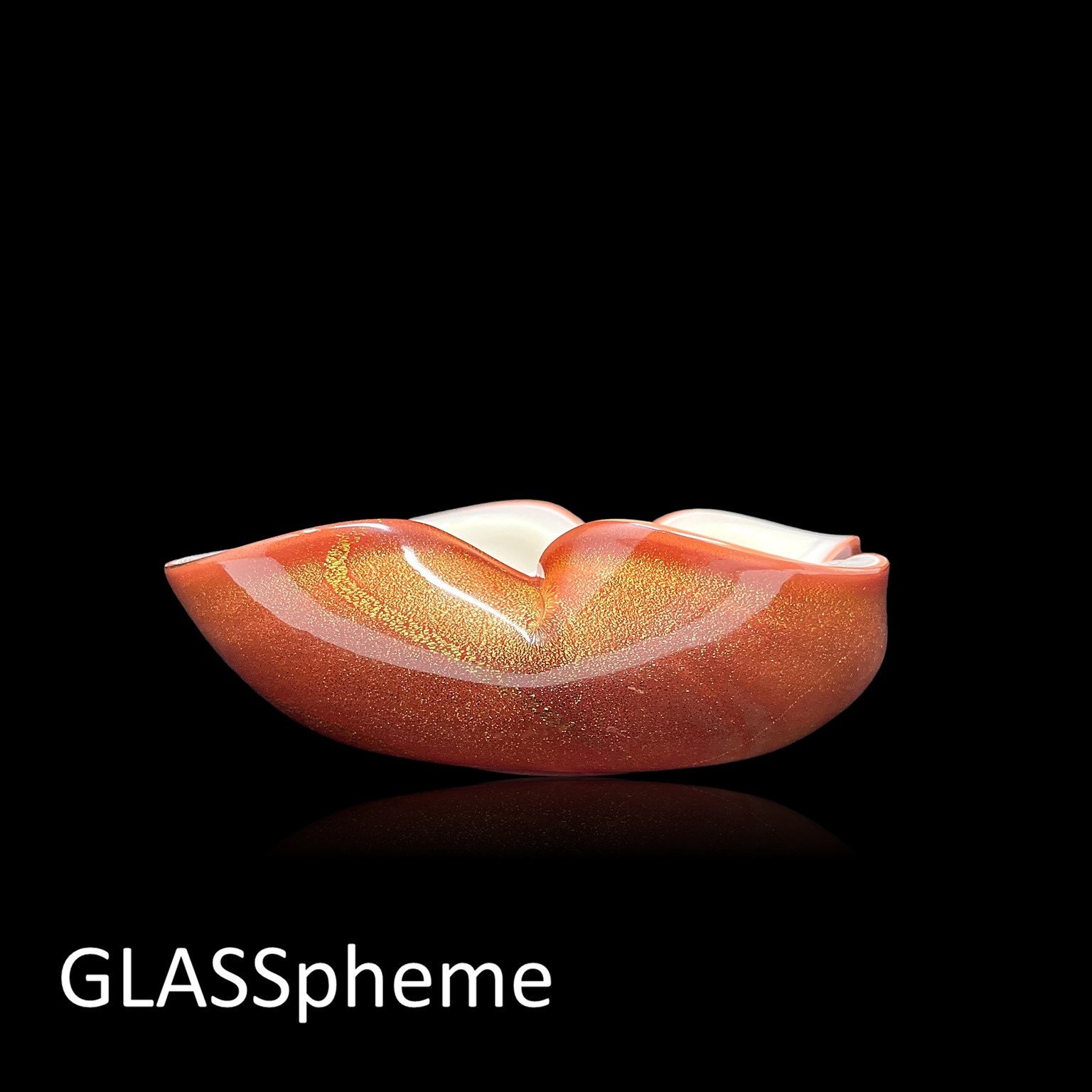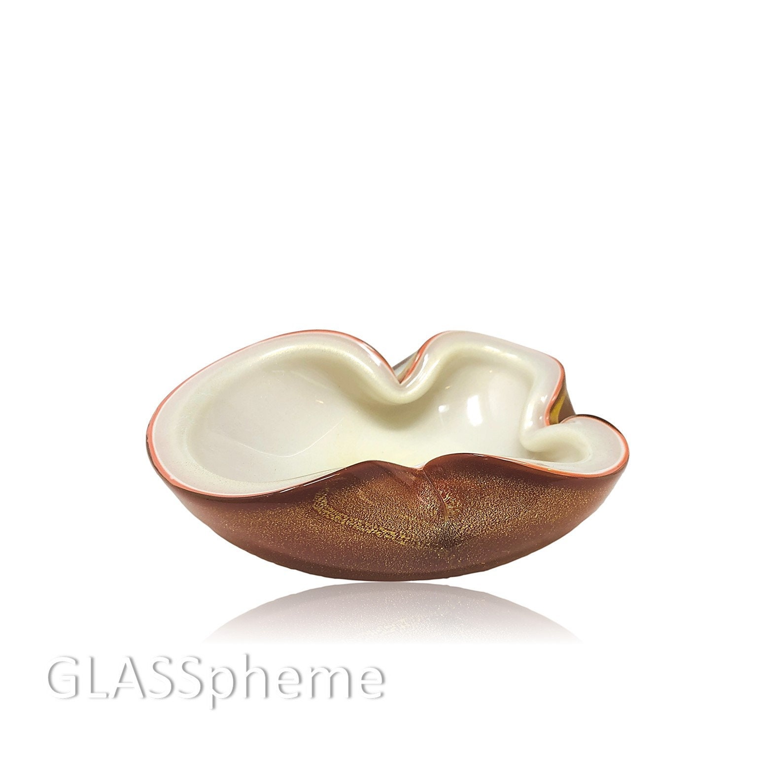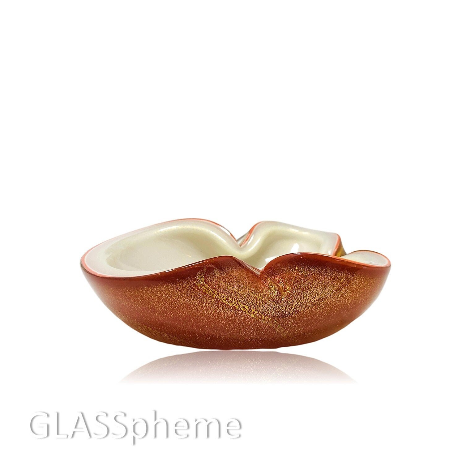 This exquisite jewel of a Murano bowl is unmarked but it sports all the hallmarks of Alfredo Barbini. This breathtaking beauty is done in "Chinese orange" glass layered over creamy lattimo (incamiciato) with a thin layer of gold aventurine throughout, and the bowl's exterior then encased in crystal. What a killer beautiful piece in the mintiest of condition!
