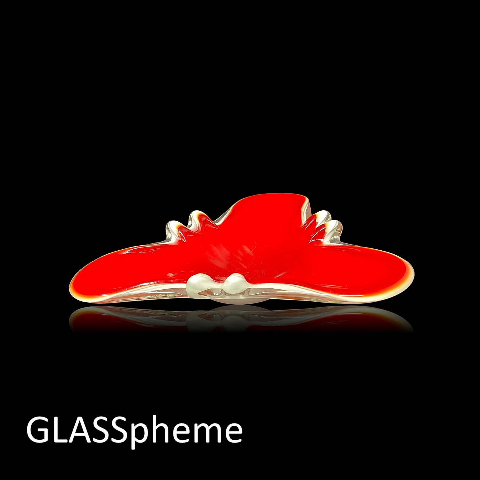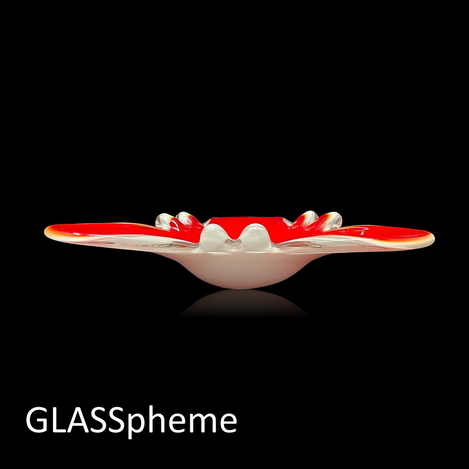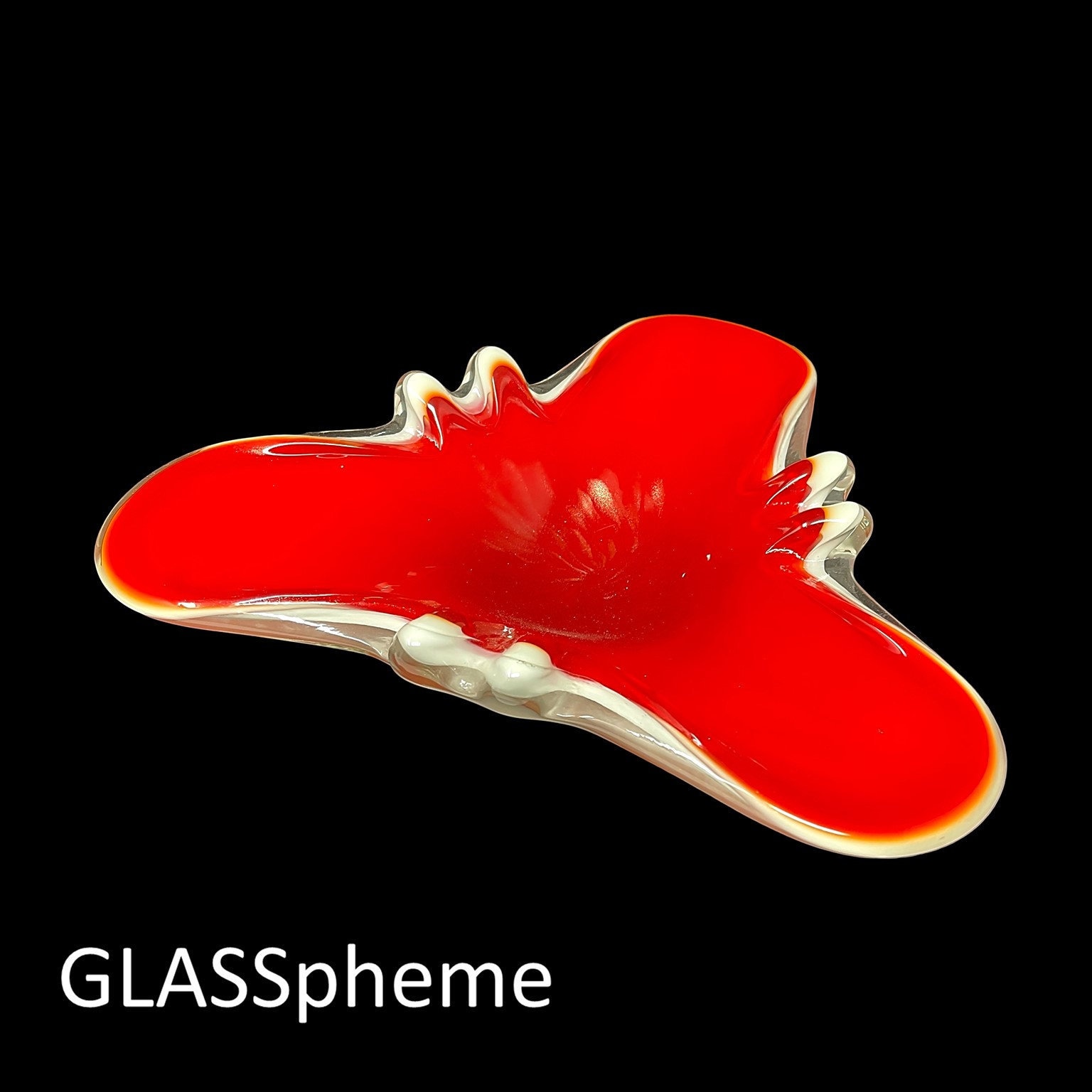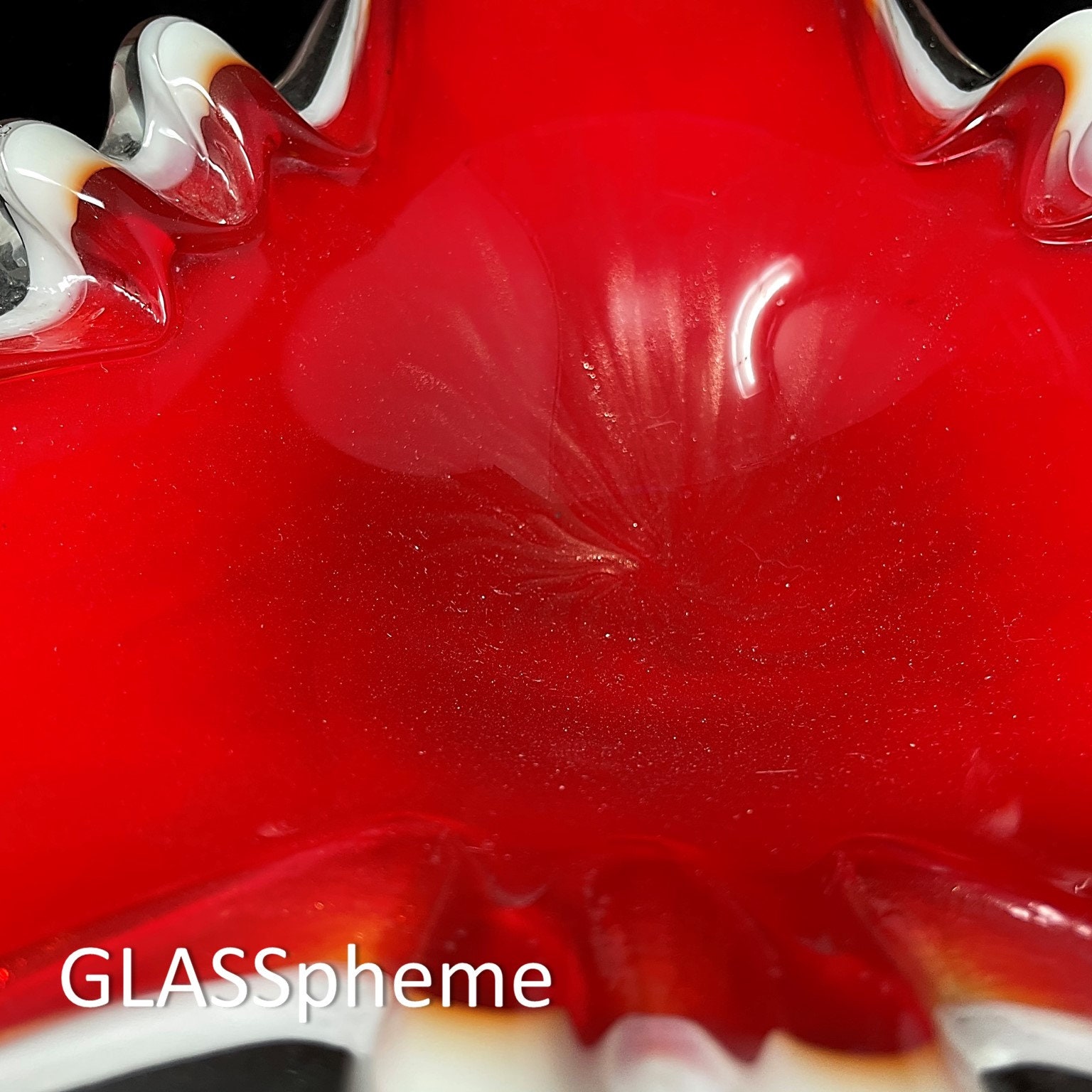 This fire engine red and white biomorphic/freeform cased glass Fratelli Toso bowl | dish | ashtray with copper flecks is a bold, beautifully formed blast of color for your home. I can't get enough of these mid-century beauties, and use them as trinket and soap dishes throughout the house.