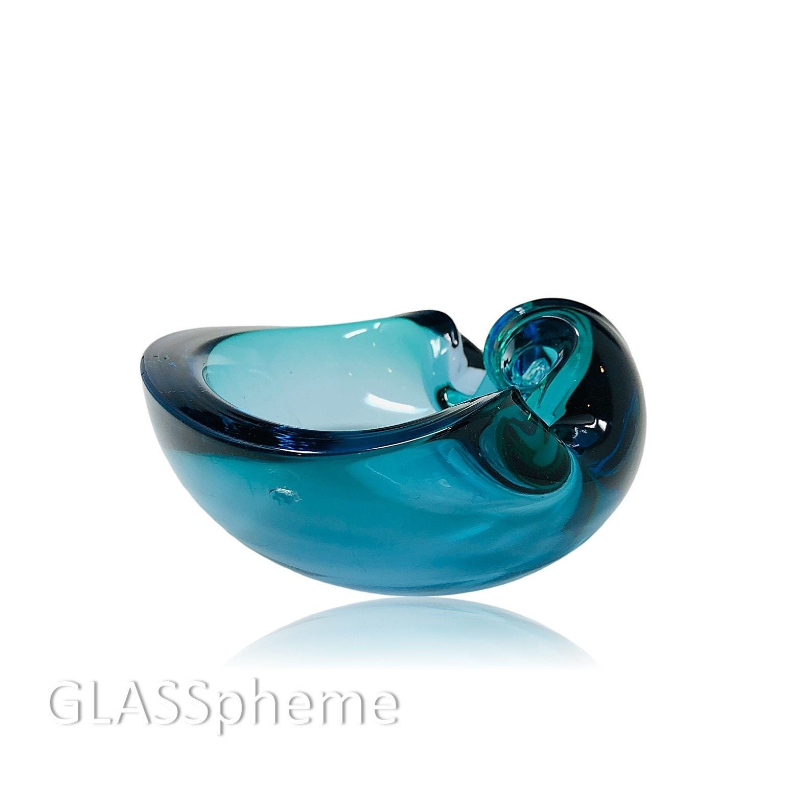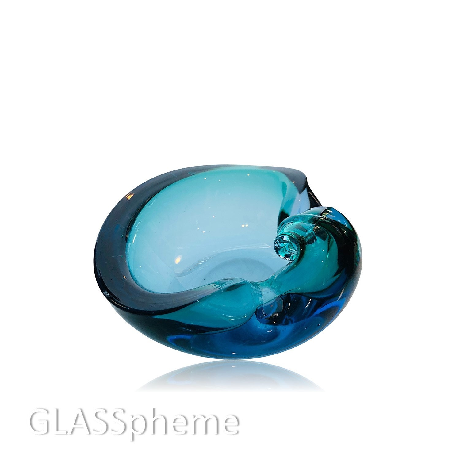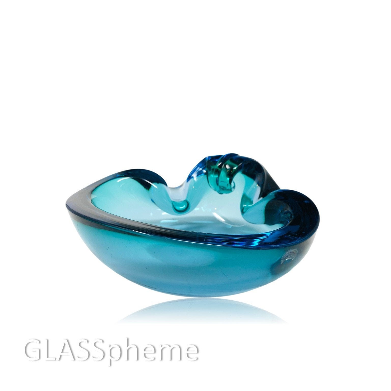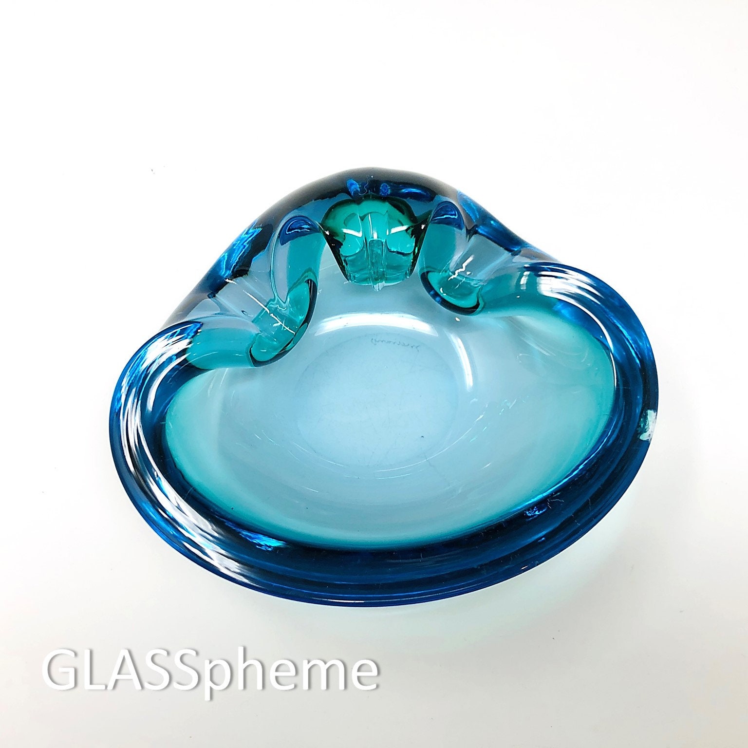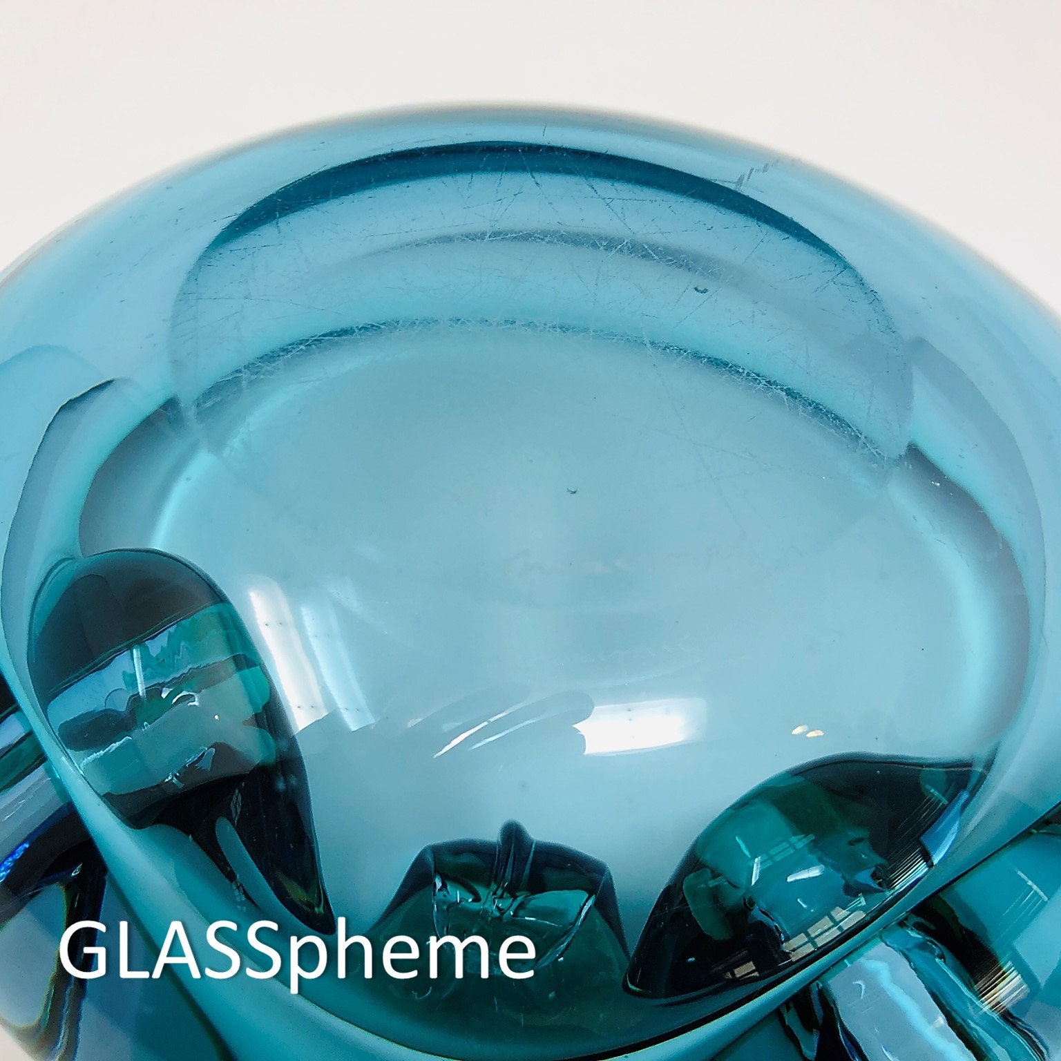 This dreamy large mid-century Murano biomorphic sommerso glass bowl or ashtray probably by Alfredo Barbini is done in dreamy turquoise blue and sea green glass using the sfumato technique (where the different colors blend so seamlessly, you can't be sure of where one ends and another begins). Clearly an extraordinarily high quality piece, there is an illegible signature on the base. The sublime coloring, marvelous craftmanship and glorious heft (3 lbs, 6 oz) make this piece absolutely breathtaking even while it hasn't escaped its 60-70 years unscathed. Aside from significant base wear, there is occasional scratching on the surface as well as an internal fracture the size of a finger-tip.