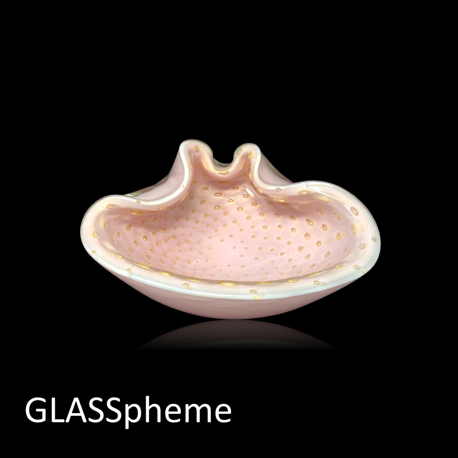 You're looking at a large exquisite and complex pink mid-century Murano bullicante glass bowl or ashtray that screams Alfredo Barbini. This beauty in done in a creamy pink pastel lattimo bullicante glass glittering with gold and encased in clear crystal glass. Large and heavy, this beauty weighs just shy of 3 lbs! This is a lovely vintage piece in super minty condition (maybe some light base wear if you look hard) that would make an awesome gift!