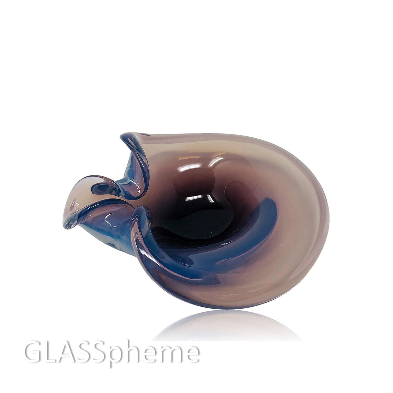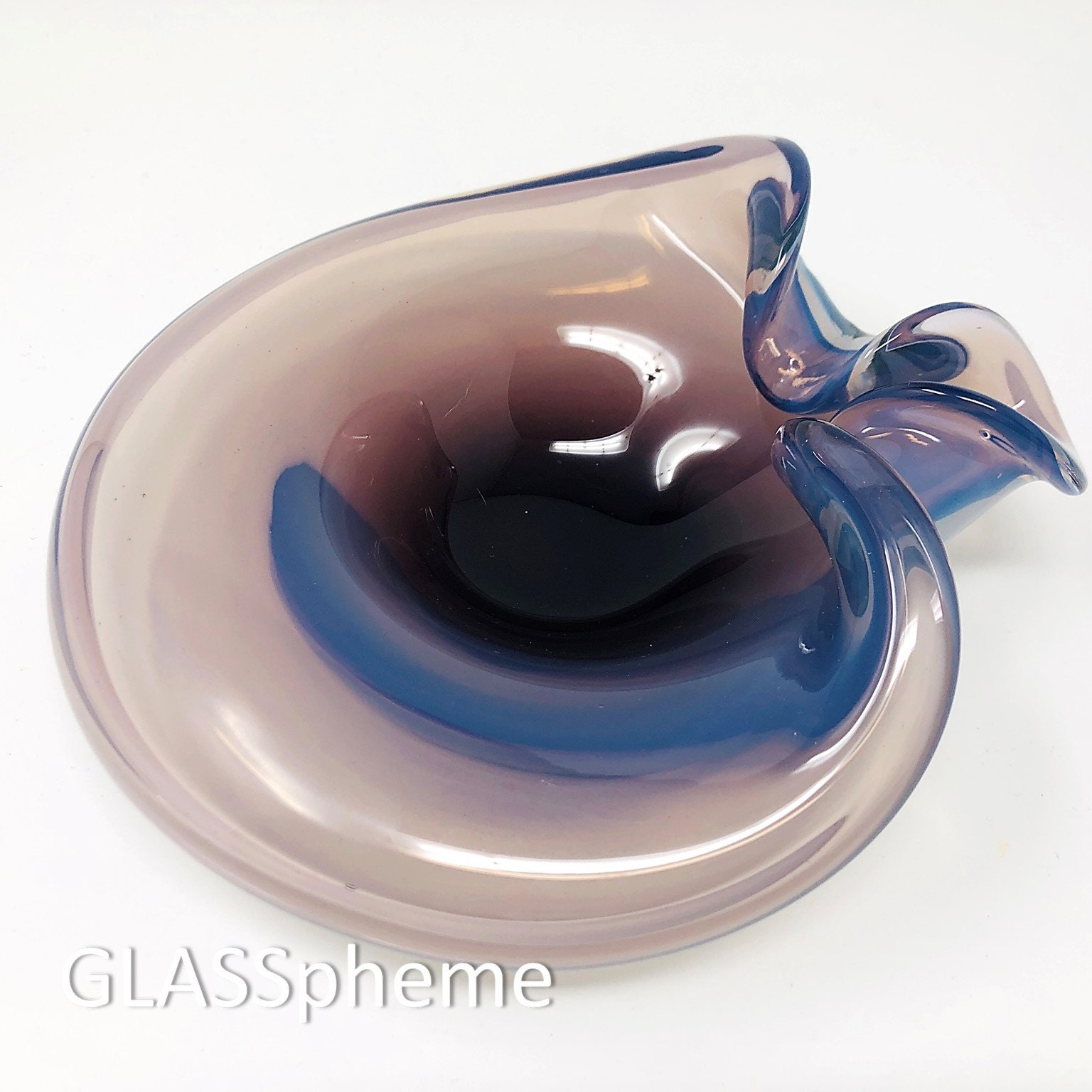 You are looking at a DREAMY mid-century Murano opalescent/opalino glass bowl or dish by Cenedese in purple. Describing the magic in this extraordinary piece defies words—it has as many moods as there are shifts in light in its environment. Soft purple, lavender, and some where the blue in its DNA takes over. This beauty is unmarked but its highest quality Murano maestro origins are unmistakable and there are examples online of this design both signed and with the Cenedese label (see link below).