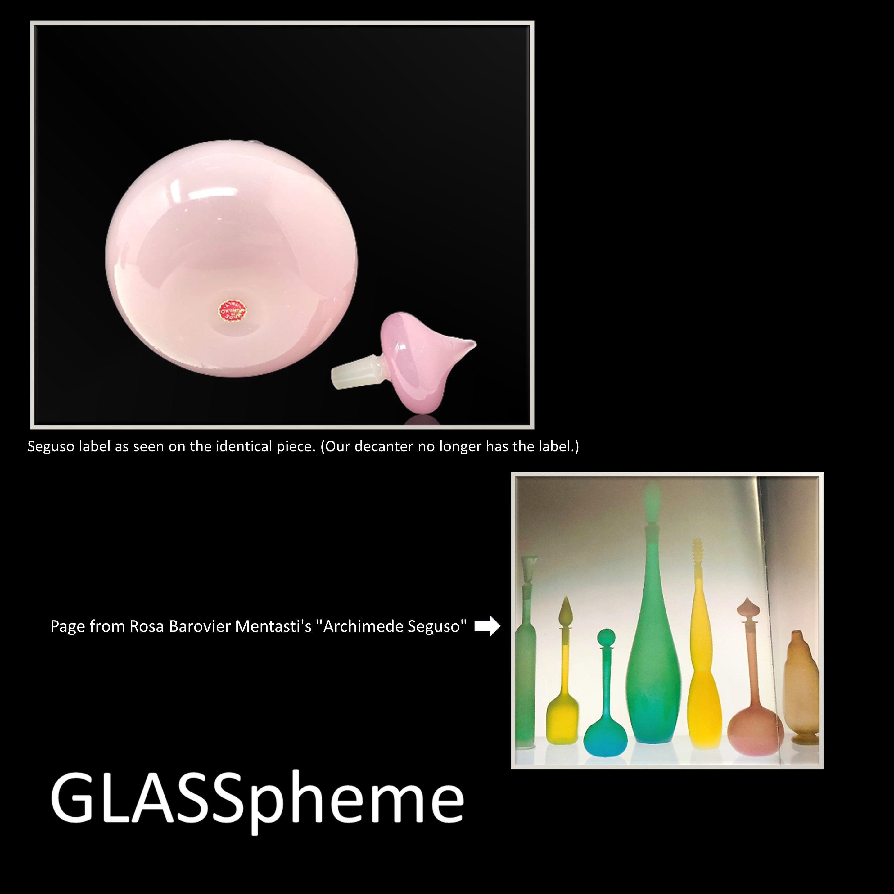 Take a deep breath—you're looking at a rarely seen, highly coveted and crazy gorgeous mid-20th century glass decanter by Archimede Seguso done in dreamy pink alabastro. This piece is also featured in Rosa Barovier Mentasti's "Archimede Seguso" and we've included a photo of the same design WITH the recognizable Seguso label on the base, though ours does not (see last photo).