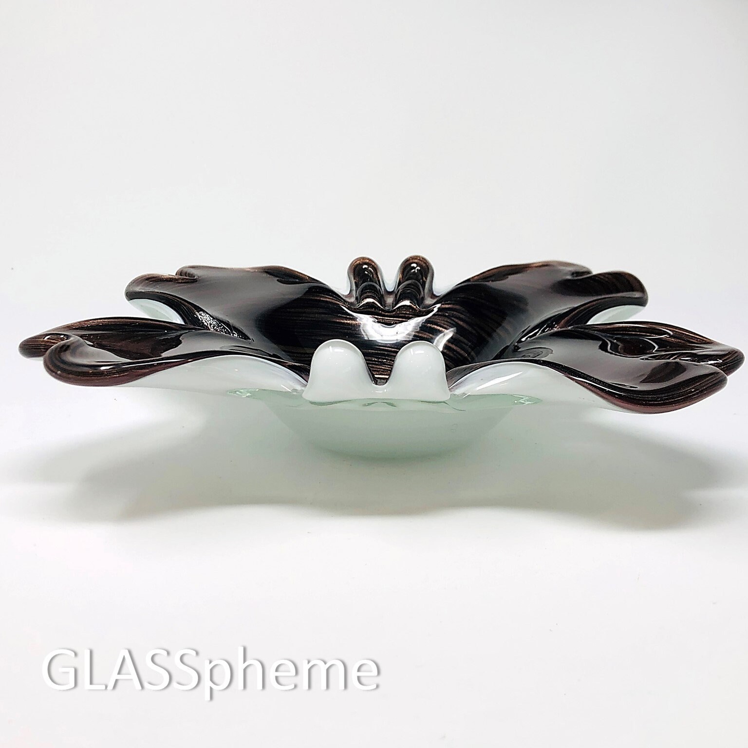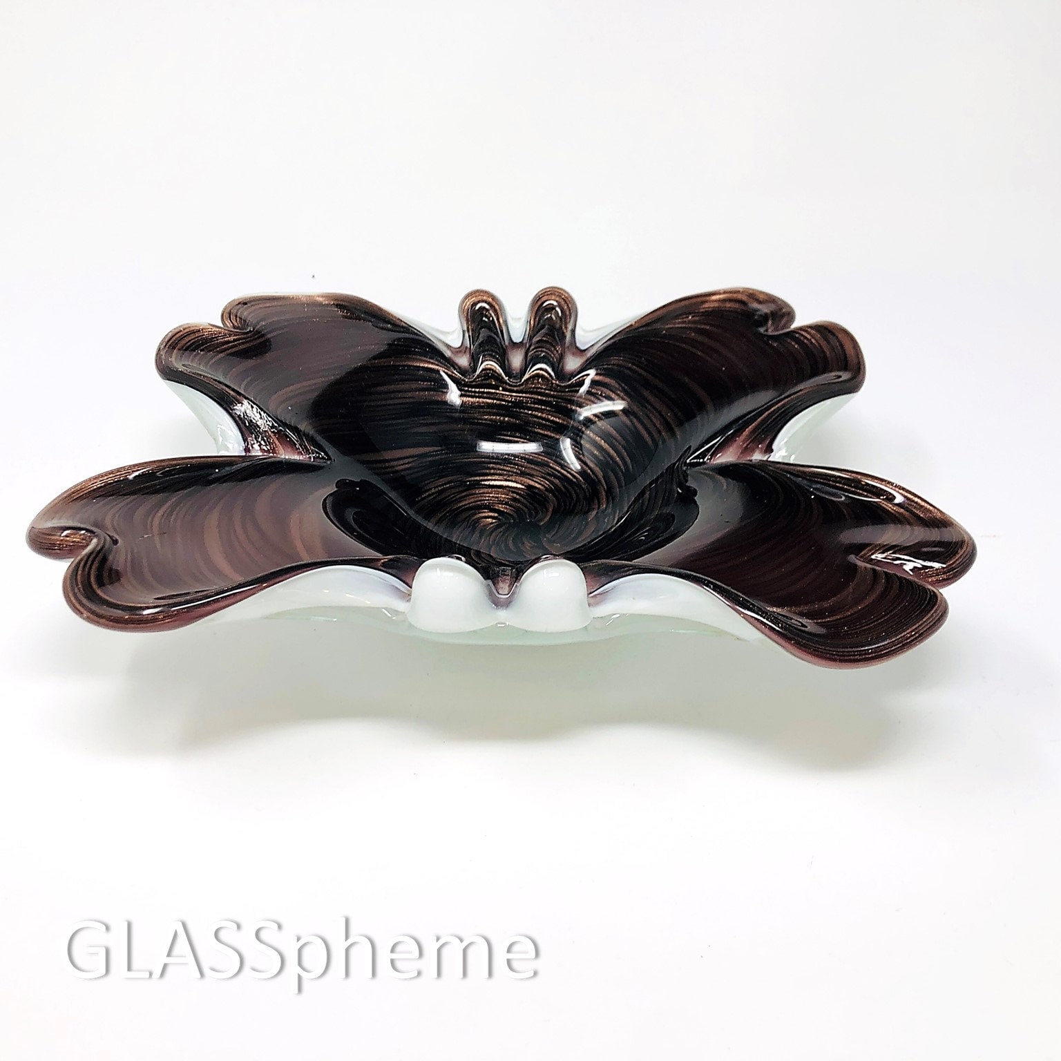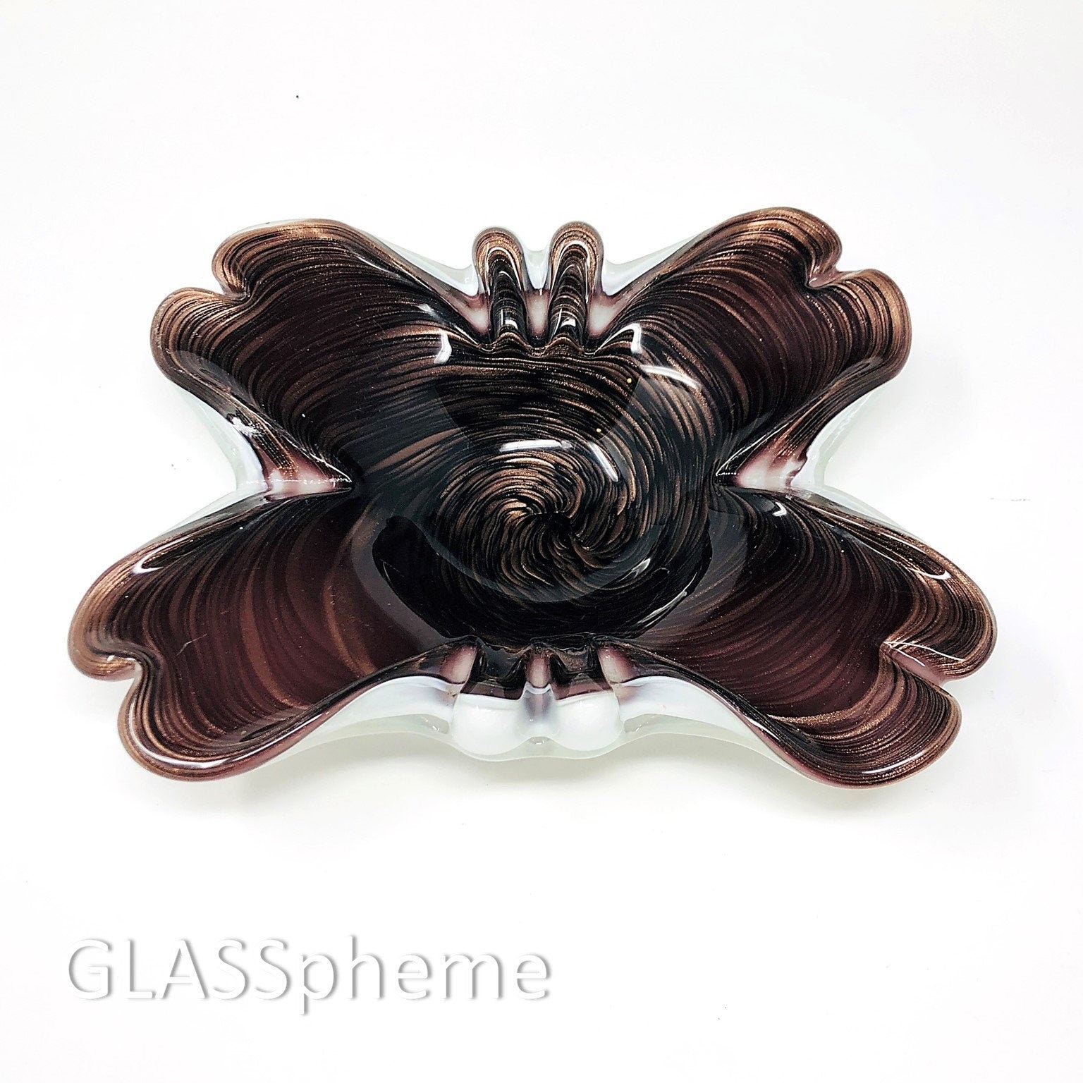 Feast your eyes on this crazy gorgeous Fratelli Toso biomorphic dish/bowl in a deep exotic eggplant hue festooned with copper swirls on a lattimo base! While there is no longer a label on it, this beauty is unmistakably Fratelli Toso. Moreover, this marvelous piece is in near PRISTINE condition with near-undetectable base wear. I love using these beauties everywhere—as soap dishes, trinket dishes, etc. Of course, the indentations make them ideal ashtrays as well, even for cigars.