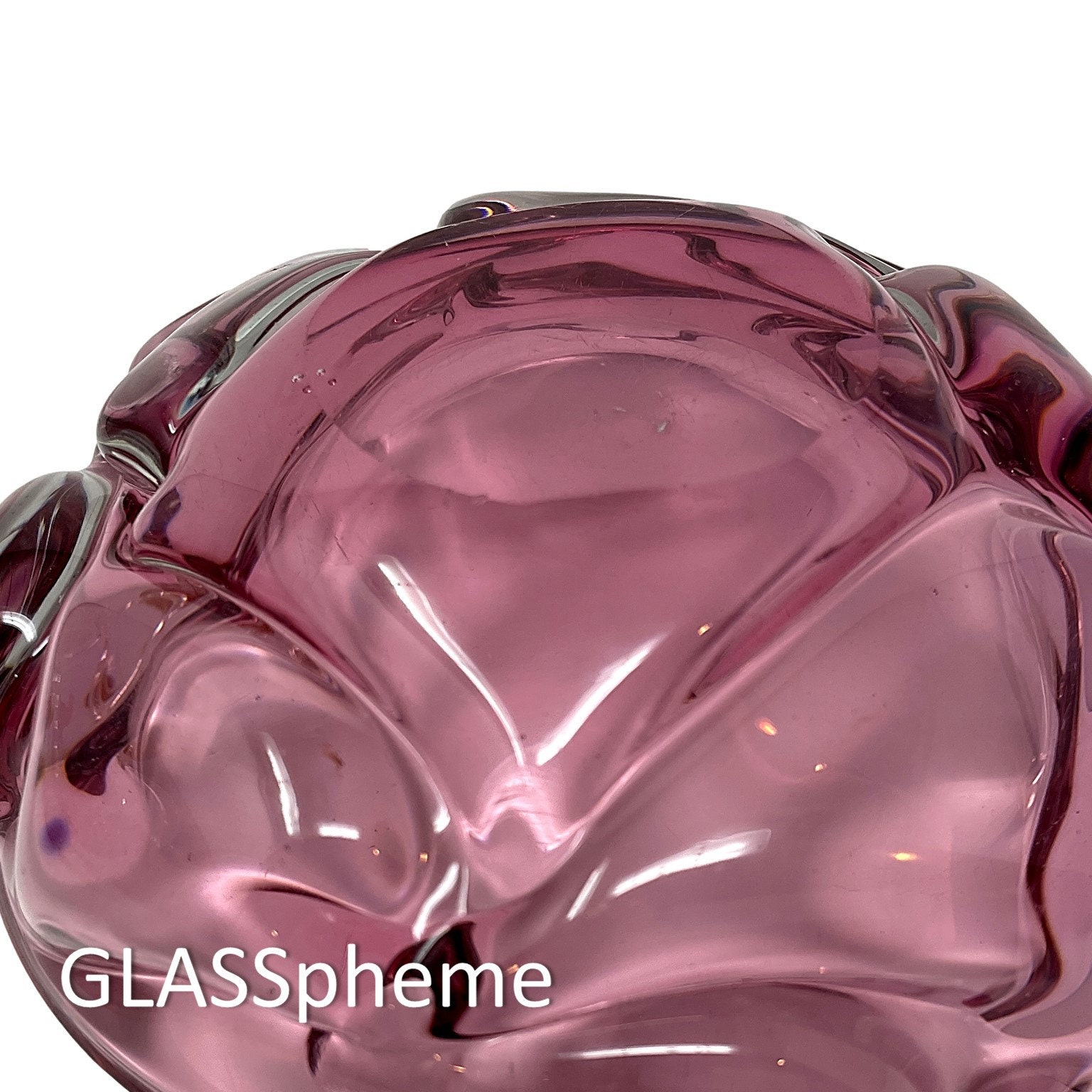 Condition: Very Good; light scratching on interior and exterior base; minor production issues (a couple of tiny burst bubbles, pink inclusions in bowl.)
