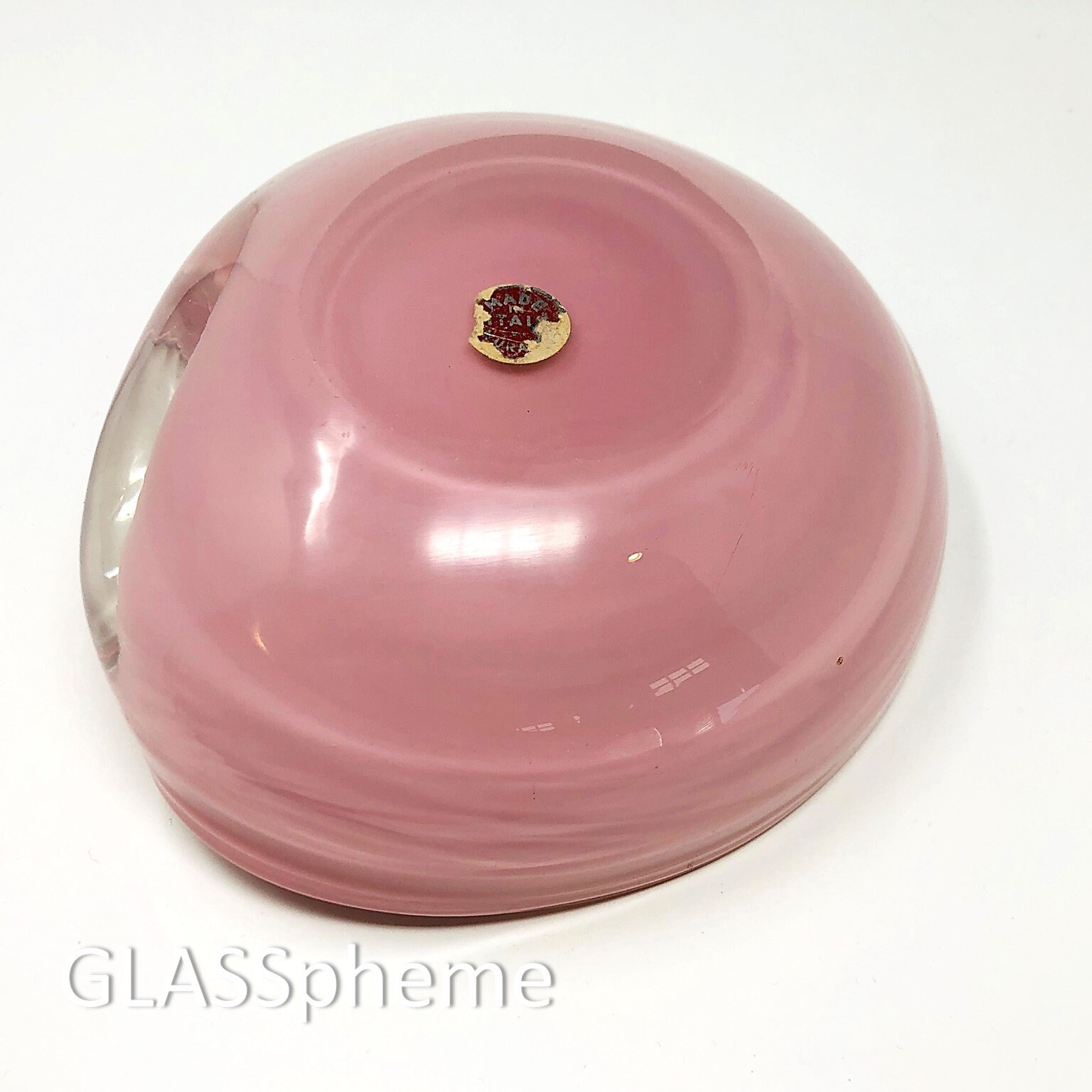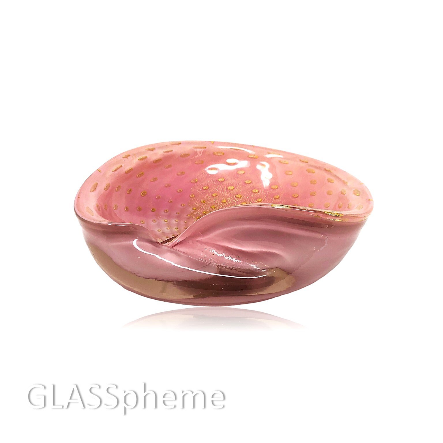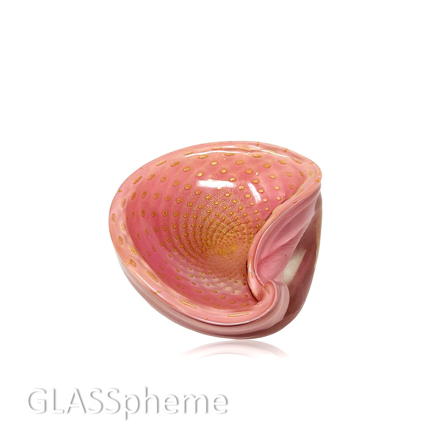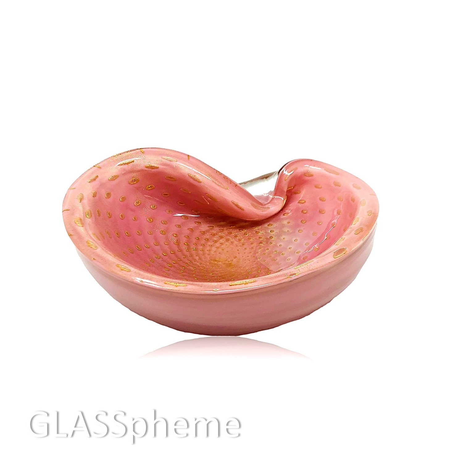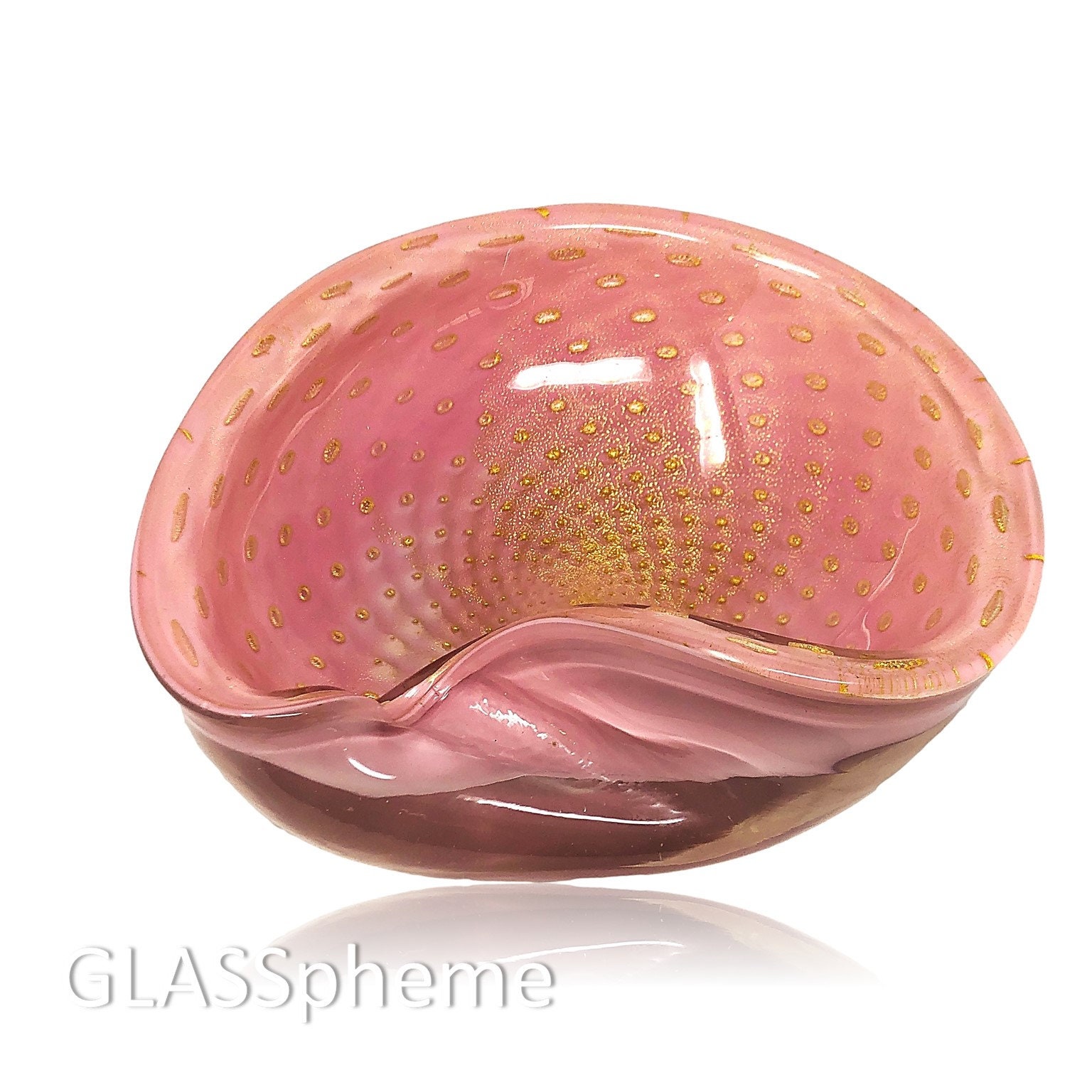 You're looking at a large exquisite and complex pink mid-century Murano bullicante glass bowl or ashtray that screams Alfredo Barbini, but (given the label on the base) was actually made by A.VE.M (Arte Vetraria Muranese)! Naturally, popular designs have always been copied amongst Murano furnaces, and its no surprise that AVEM got in on this action. This beauty in done in a creamy pink pastel lattimo bullicante glass glittering with gold and encased in clear crystal glass. Large and heavy, this beauty weighs in at over 3 lbs! This is a lovely vintage piece in super minty condition (maybe some light base wear if you look hard) that would make an awesome gift!
